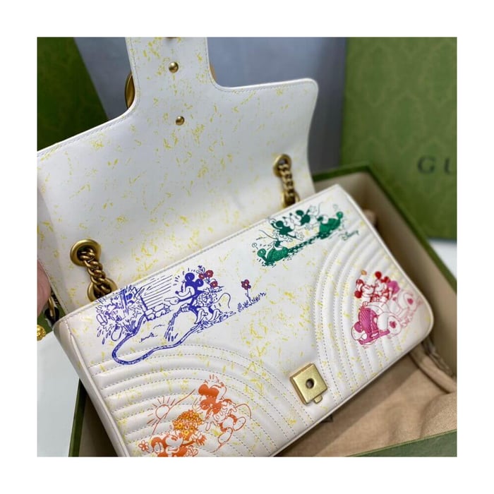 – Multicolor Mickey and Minnie Mouse print ivory matelassé chevron leather