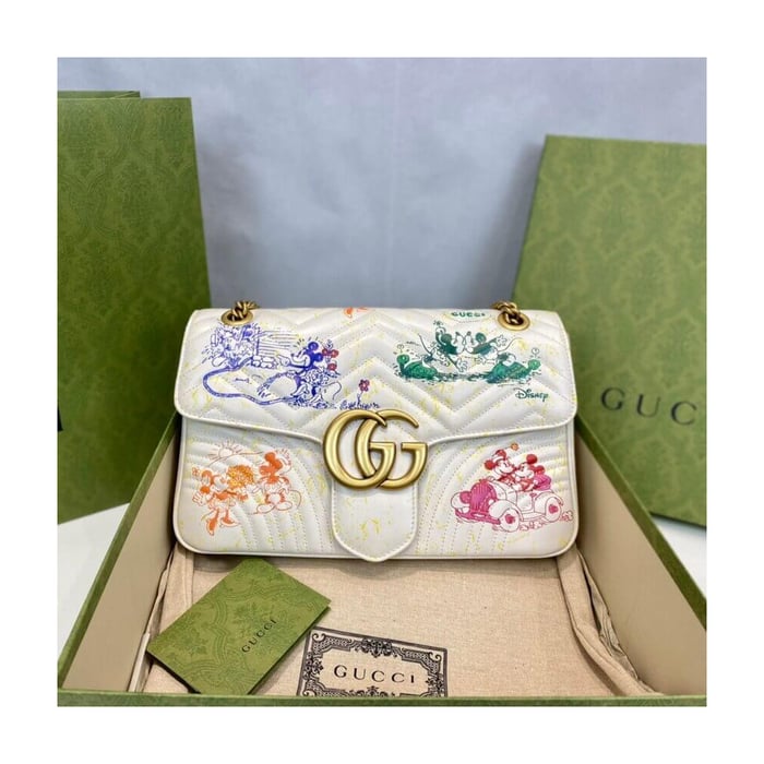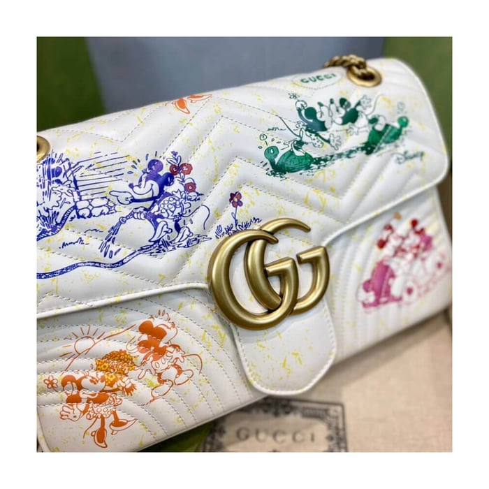 The playful image of Mickey and Minnie Mouse defines this GG Marmont medium shoulder bag in ivory matelassé leather. In celebration of the Lunar New Year, Disney’s legendary characters appear throughout Gucci’s ready-to-wear and accessories for the Cruise 2020 collection, displayed as colorful prints, embroidered patches or jacquard motifs.
