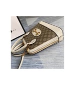 Crafted from beige/ebony GG Supreme canvas with crisp white leather trim, the bag features a cotton-linen lining and gold-toned hardware. A detachable and adjustable shoulder strap adds versatility, while protective metal feet and practical interior compartments ensure both style and function.