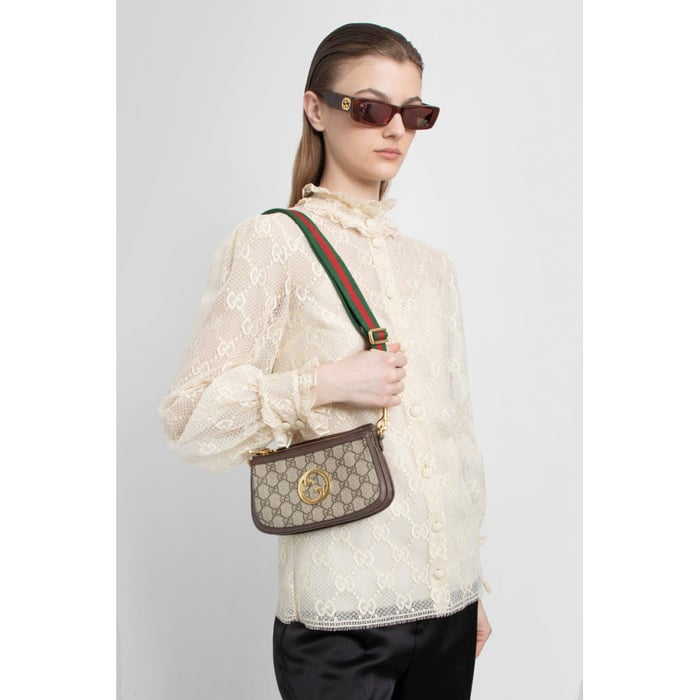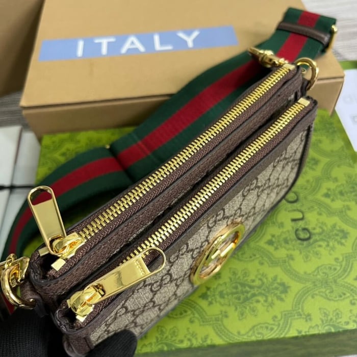 The Round Interlocking G emblem comes straight from the House archives. Emblems representative of Founder Guccio Gucci’s initials, have been reworked in a variety of forms and interpretations. Here it sits atop a beige and ebony GG Supreme canvas base, enriched with a green and red Web strap, resulting in a modern variation of a classic accessory.