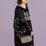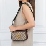 The Round Interlocking G emblem comes straight from the House archives. Emblems representative of Founder Guccio Gucci’s initials, have been reworked in a variety of forms and interpretations. Here it sits atop a beige and ebony GG Supreme canvas base, enriched with a green and red Web strap, resulting in a modern variation of a classic accessory.