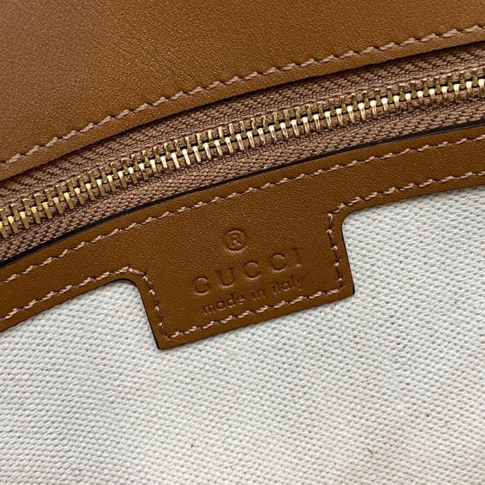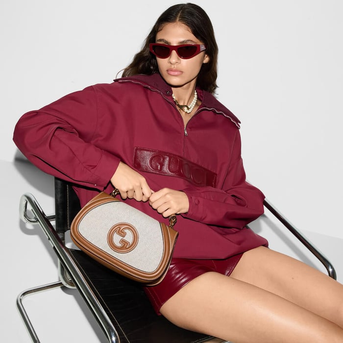 The new Gucci Blondie bag, whose distinctive logo first appeared in the House’s collections in the early 1970s, weaves together past and present in a fusion of nostalgia and modernity. Presented in fresh beige cotton linen canvas and smooth brown leather trim, this small bag is complete with a top handle and adjustable shoulder strap.