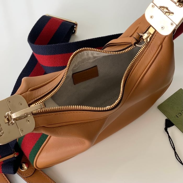 An ode to the timeless Hollywood glamour that shaped Gucci Love Parade, classic elements from the House’s archives are reintroduced. Distinguished by its crescent moon shape, the accessory is further defined by a G shaped hook closure. Paired with soft materials, the heritage hardware creates a refined design with vintage appeal. This small version is crafted in black leather with orange and black Web trim.