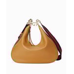 An ode to the timeless Hollywood glamour that shaped Gucci Love Parade, classic elements from the House’s archives are reintroduced. Distinguished by its crescent moon shape, the accessory is further defined by a G shaped hook closure. Paired with soft materials, the heritage hardware creates a refined design with vintage appeal. This small version is crafted in black leather with orange and black Web trim.