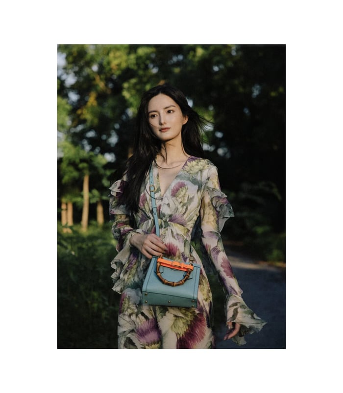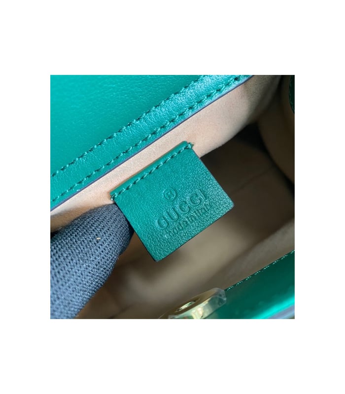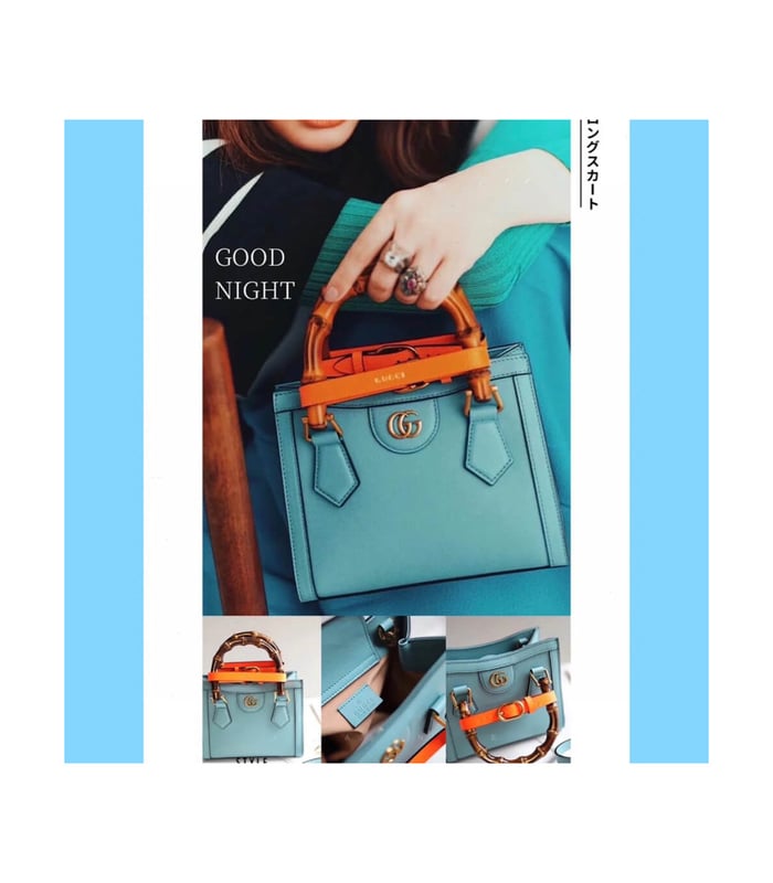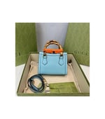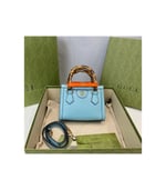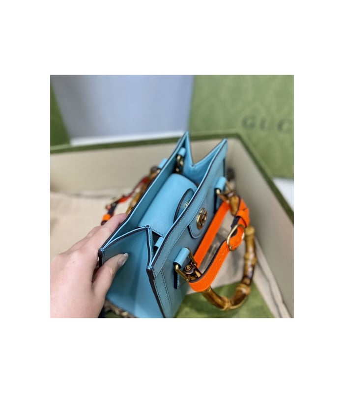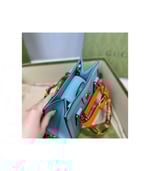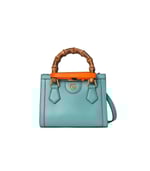 Combining recognizable elements of the House, the mini tote bag is defined by its bamboo handles and Double G hardware. Crafted from light blue leather, the accessory is further accentuated by two neon bands, a playful reference to the bands used to keep handles in shape.