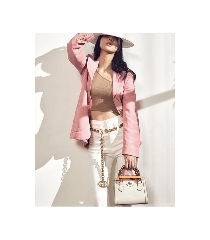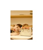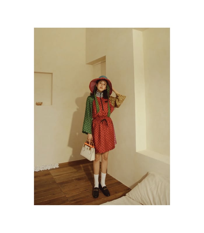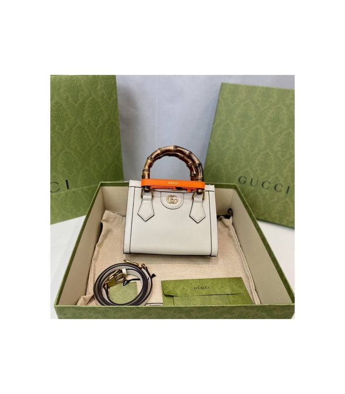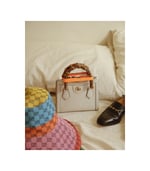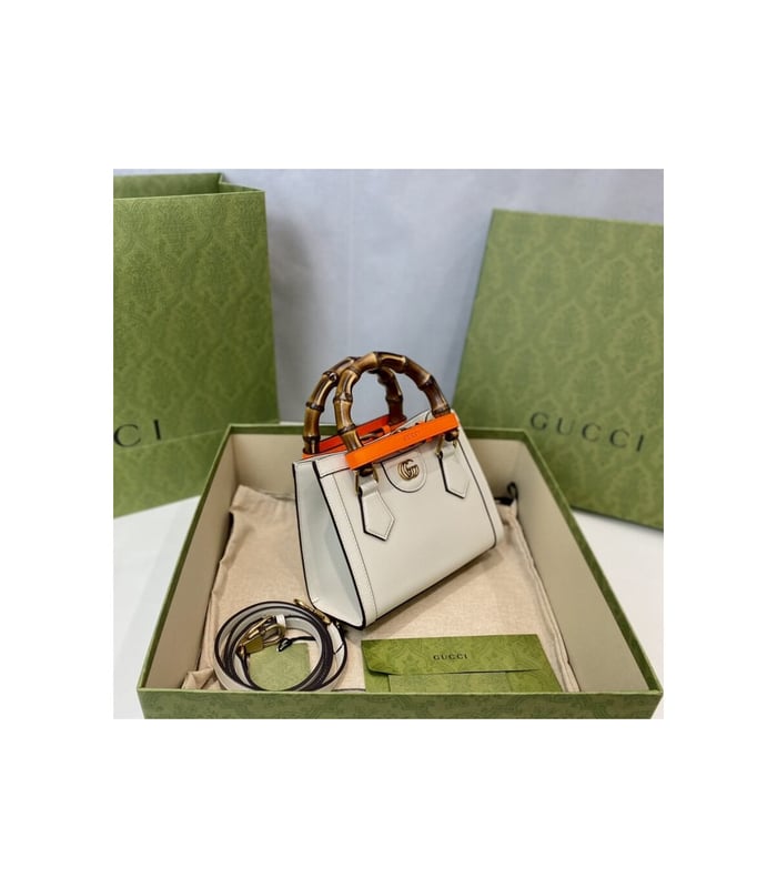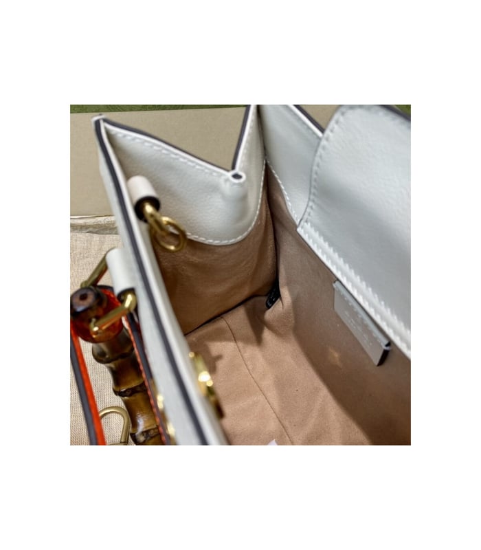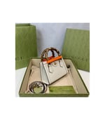 Combining recognizable elements of the House, the mini tote bag is defined by its bamboo handles and Double G hardware. Crafted from light blue leather, the accessory is further accentuated by two neon bands, a playful reference to the bands used to keep handles in shape.