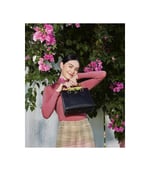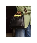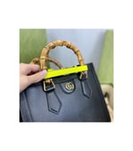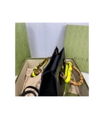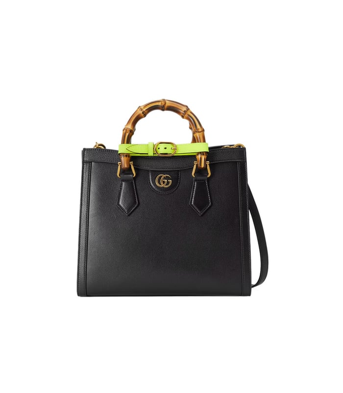 Combining recognizable elements of the House, the small tote bag is defined by its bamboo handles and Double G hardware. Crafted from black leather, the accessory is further accentuated by two neon bands, a playful reference to the bands used to keep handles in shape.