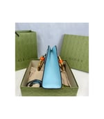 Combining recognizable elements of the House, the small tote bag is defined by its bamboo handles and Double G hardware. Crafted from black leather, the accessory is further accentuated by two neon bands, a playful reference to the bands used to keep handles in shape.