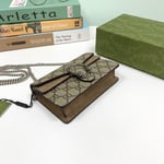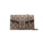 A structured GG Supreme canvas chain super mini bag with a key ring that can be used to attach this bag to a separate larger bag. The closure has the textured tiger head spur closure-a unique detail referencing the Greek god Dionysus, who in myth is said to have crossed the river Tigris on a tiger sent to him by Zeus.