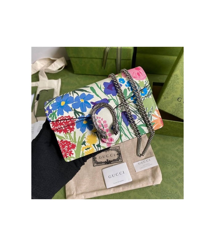 A bright botanical print by Ken Scott animates this mini shoulder bag. Nicknamed the ‘Fashion Gardener,’ Ken Scott was an American designer who lived in Milan in the ‘60s and ‘70s and whose colourful floral drawings were reflective of his eclectic personality. The Dionysus is completed by its signature tiger head closure.