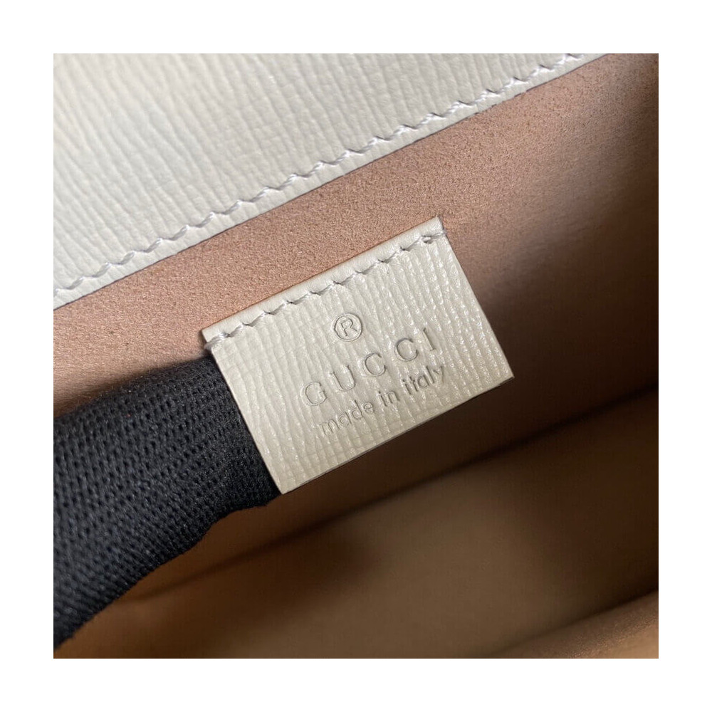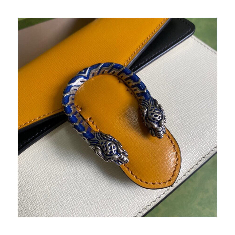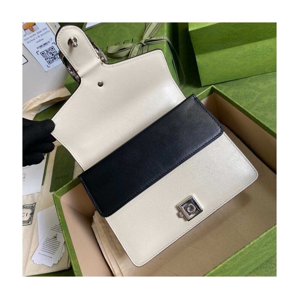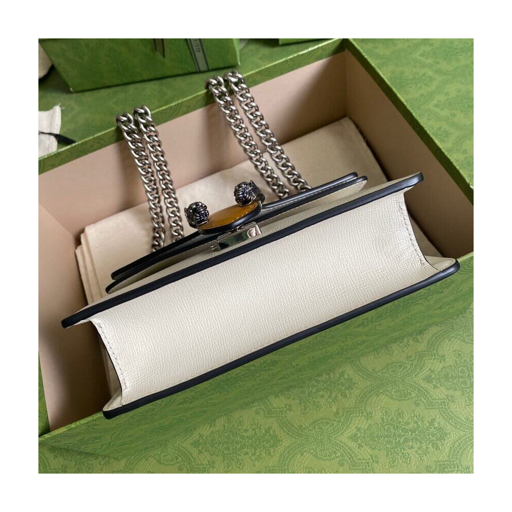 The Dionysus mini bag is presented in white textured leather with the now defining tiger head closure—a unique detail referencing the Greek god Dionysus. The closure is further enhanced with Swarovski crystals. The sliding chain strap can be worn multiple ways, changing between a shoulder and a top handle bag.