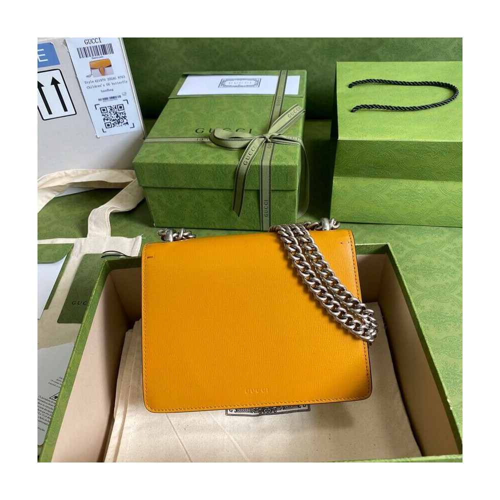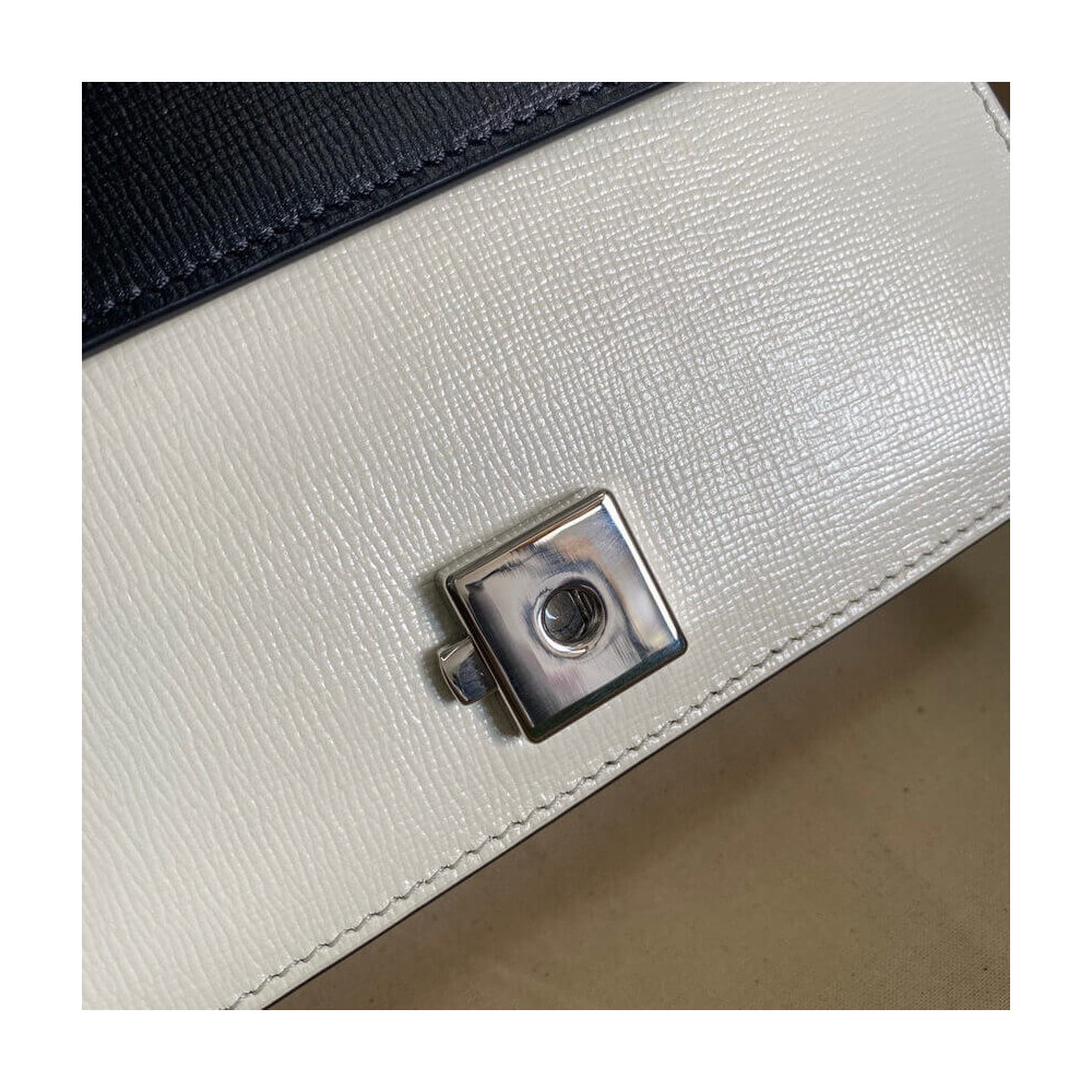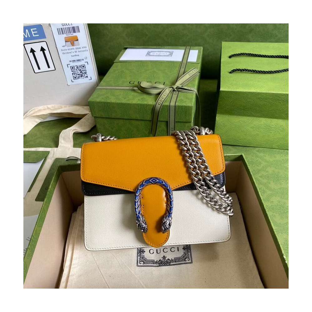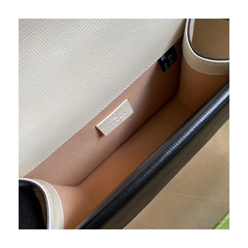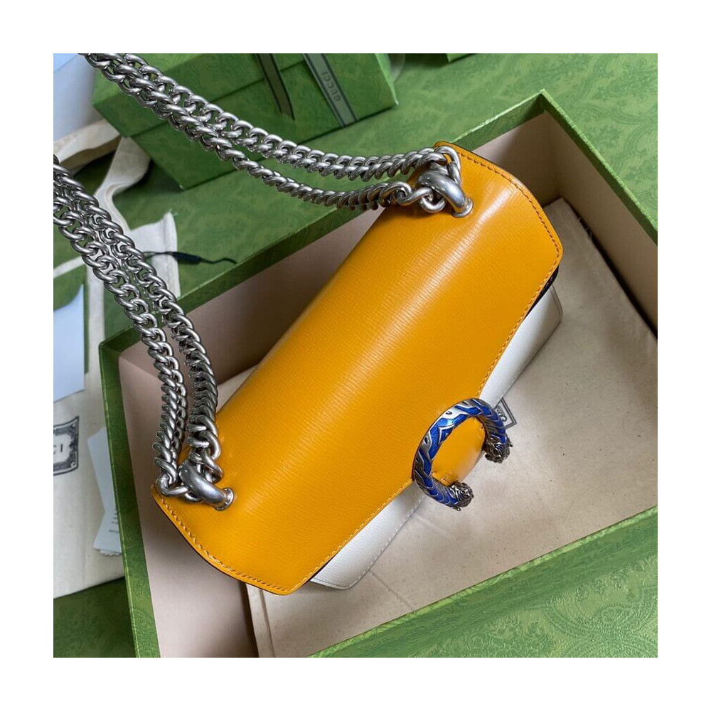 The Dionysus mini bag is presented in white textured leather with the now defining tiger head closure—a unique detail referencing the Greek god Dionysus. The closure is further enhanced with Swarovski crystals. The sliding chain strap can be worn multiple ways, changing between a shoulder and a top handle bag.