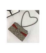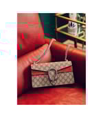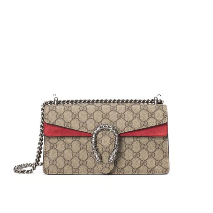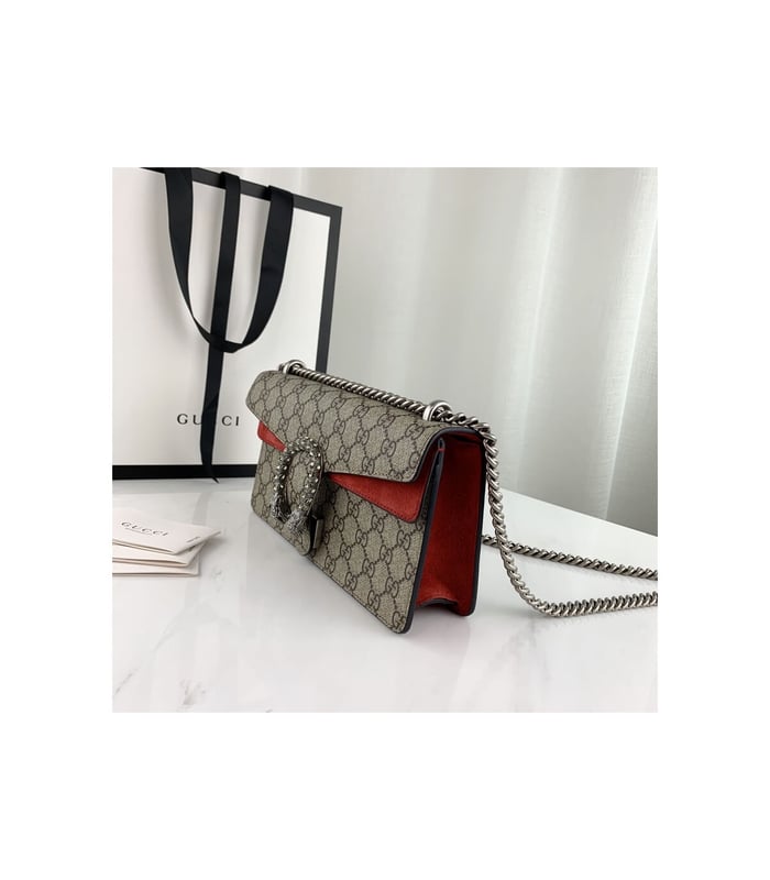 Crafted as a 1:1 rep of the original, this small Dionysus shoulder bag features the signature GG Supreme canvas paired with rich red suede trim. The iconic tiger head closure—adorned with sparkling crystals—pays homage to the myth of Dionysus. A sliding chain strap offers styling versatility as both a shoulder and top handle bag.