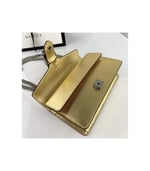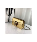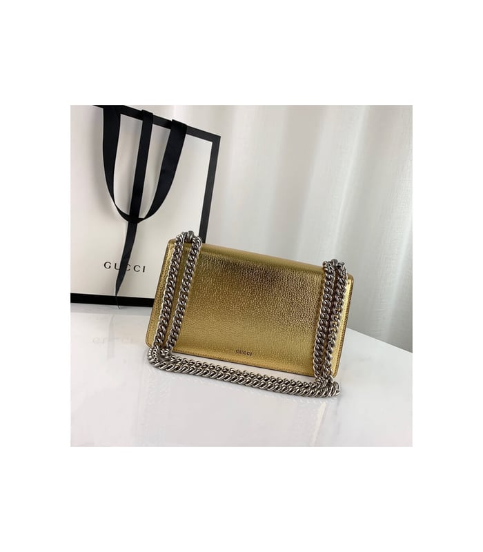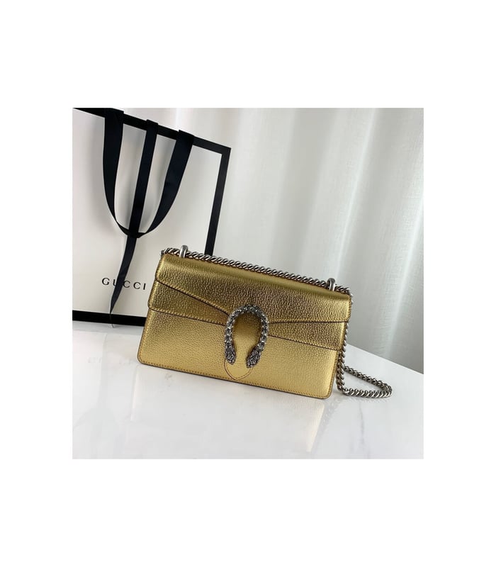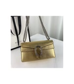 The Dionysus shoulder bag is presented in shiny silver leather. The now defining tiger head closure—a unique detail referencing the Greek god Dionysus, who in myth is said to have crossed the river Tigris on a tiger sent to him by Zeus—is further enhanced with sparkling crystals. The sliding chain strap can be worn multiple ways, changing between a shoulder, crossbody and a top handle bag.