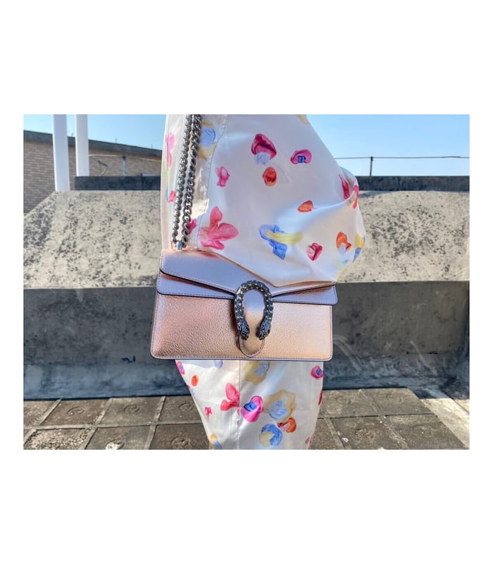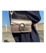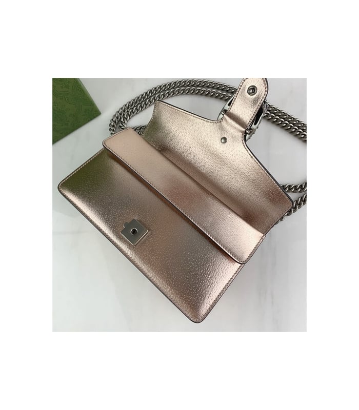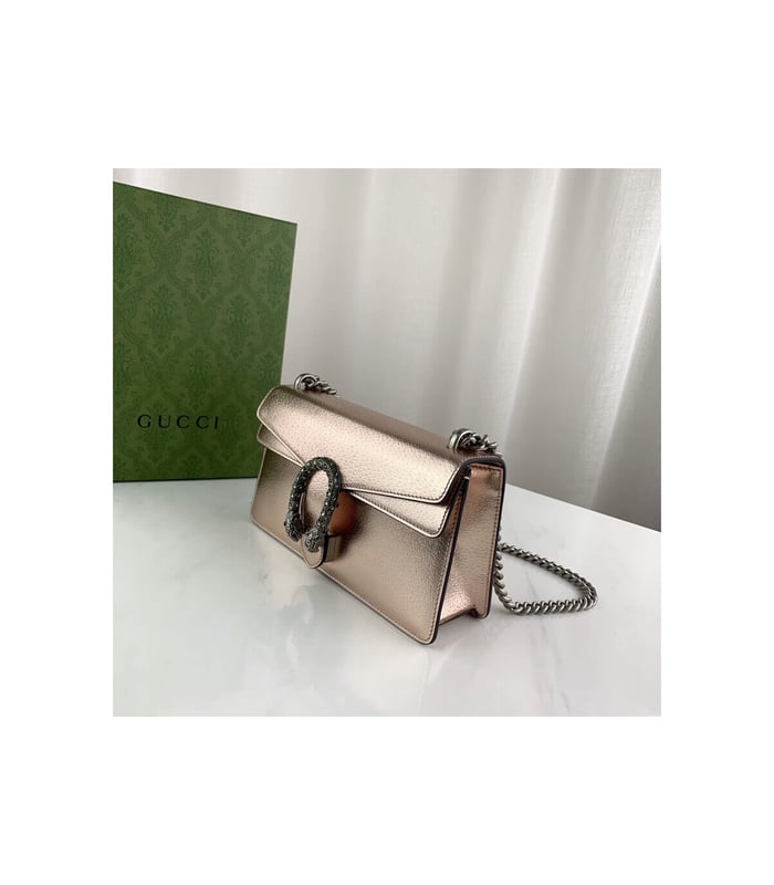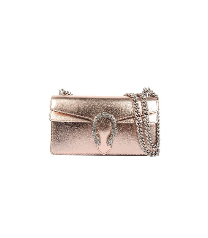 The Dionysus shoulder bag is presented in shiny silver leather. The now defining tiger head closure—a unique detail referencing the Greek god Dionysus, who in myth is said to have crossed the river Tigris on a tiger sent to him by Zeus—is further enhanced with sparkling crystals. The sliding chain strap can be worn multiple ways, changing between a shoulder, crossbody and a top handle bag.