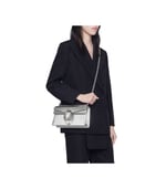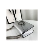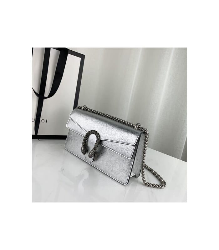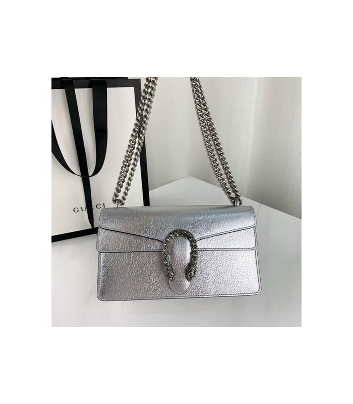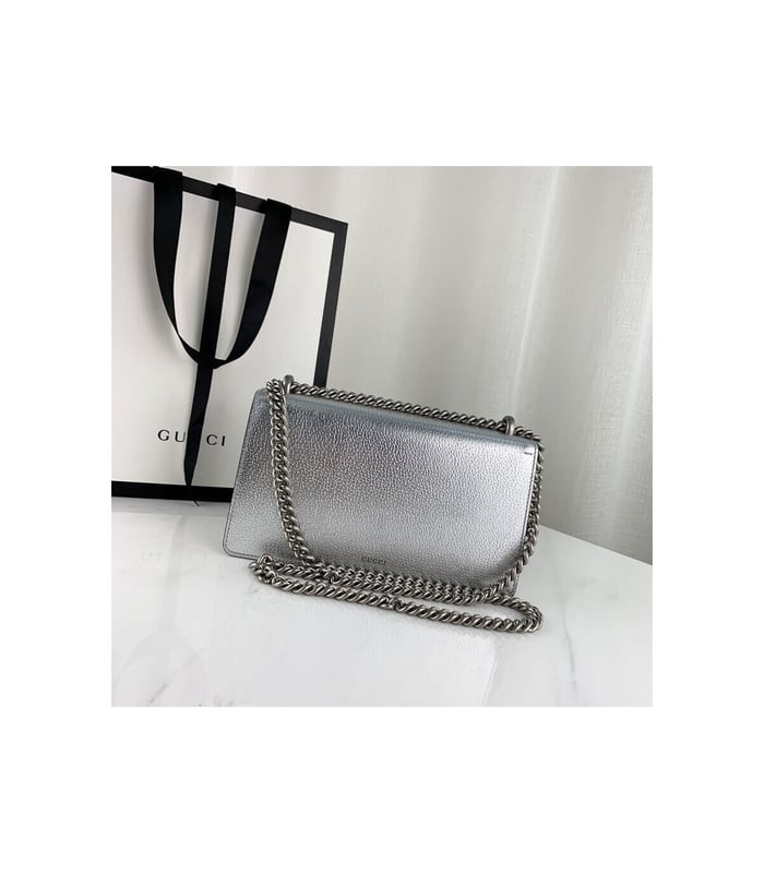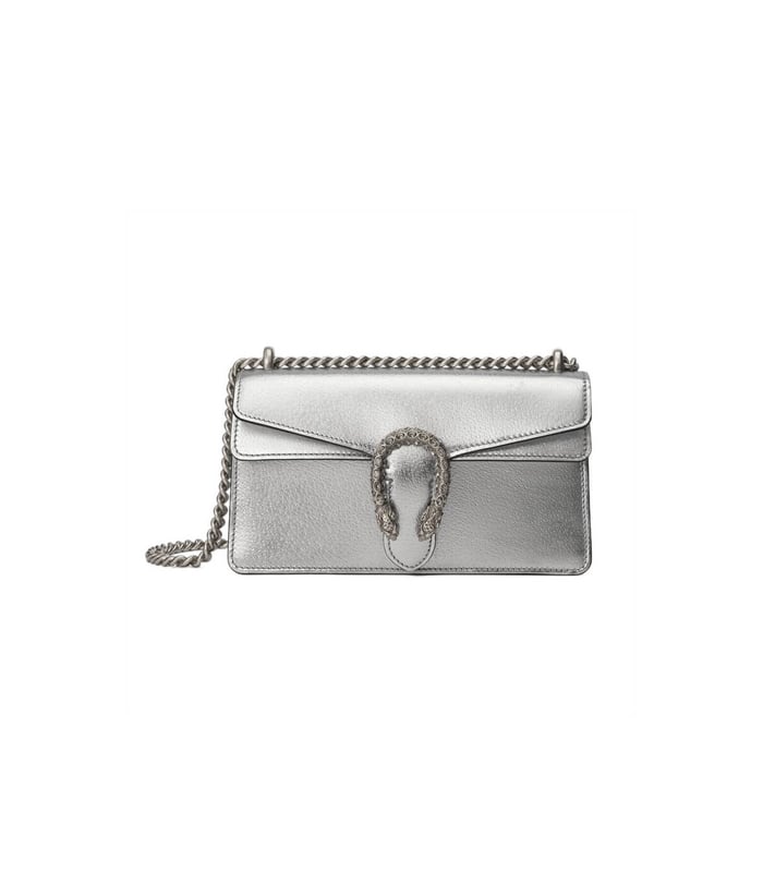 The Dionysus shoulder bag is presented in shiny silver leather. The now defining tiger head closure—a unique detail referencing the Greek god Dionysus, who in myth is said to have crossed the river Tigris on a tiger sent to him by Zeus—is further enhanced with sparkling crystals. The sliding chain strap can be worn multiple ways, changing between a shoulder, crossbody and a top handle bag.