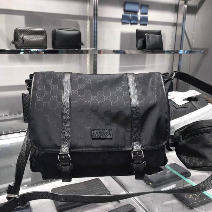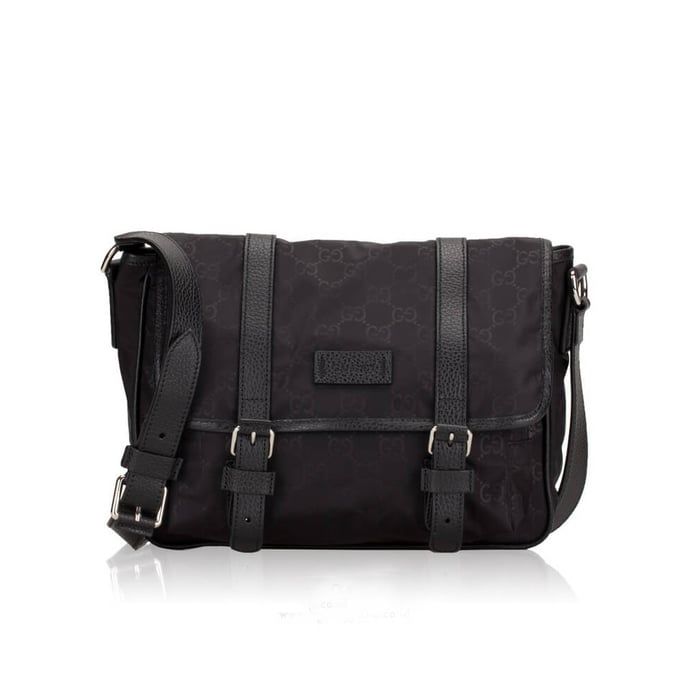 This stylish messenger bag is crafted of luxurious textured nylon in navy blue. The bag features an adjustable leather shoulder strap with silver hardware, and a facing flap with leather belts.
