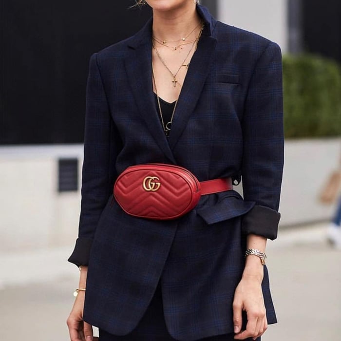 Part of the GG Marmont line, the belt bag was presented for the first time by Alessandro Michele in the Pre-Fall 2017 collection. It has a sportswear-inspired rounded shape with a leather belt which is designed so the bag can be worn high on the waist. It features the recognizable Double G detail-an archival play on the Running G.