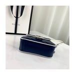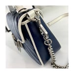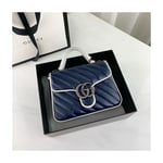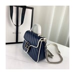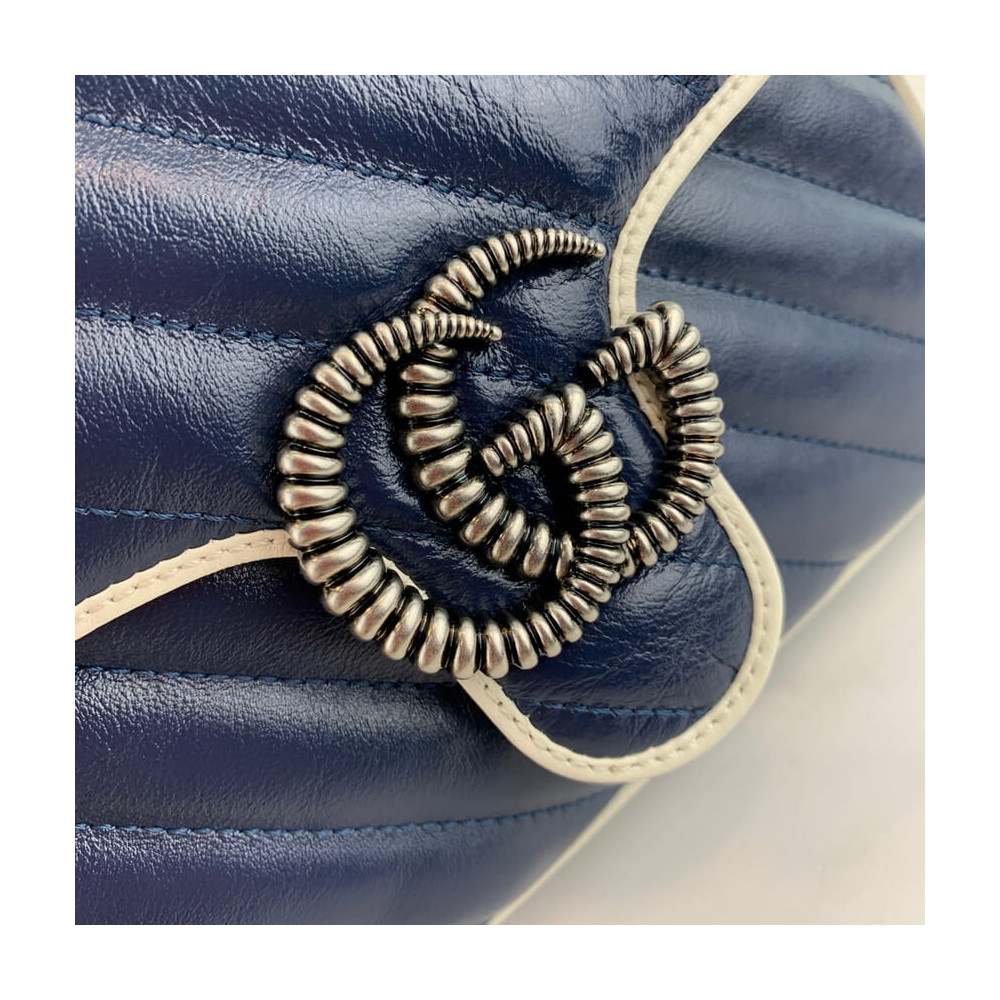 The GG Marmont bag introduced in blue for Cruise 2020, made from diagonal matelassé quilted leather and completed with a twisted torchon Double G embellishment. The mini top handle’s distinct softly structured shape is outlined in contrast white piping, highlighting its oversized flap closure. A removable chain strap allows the satchel shape to also be worn as a shoulder bag.