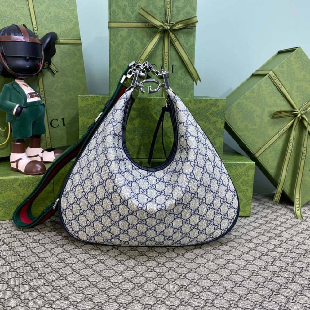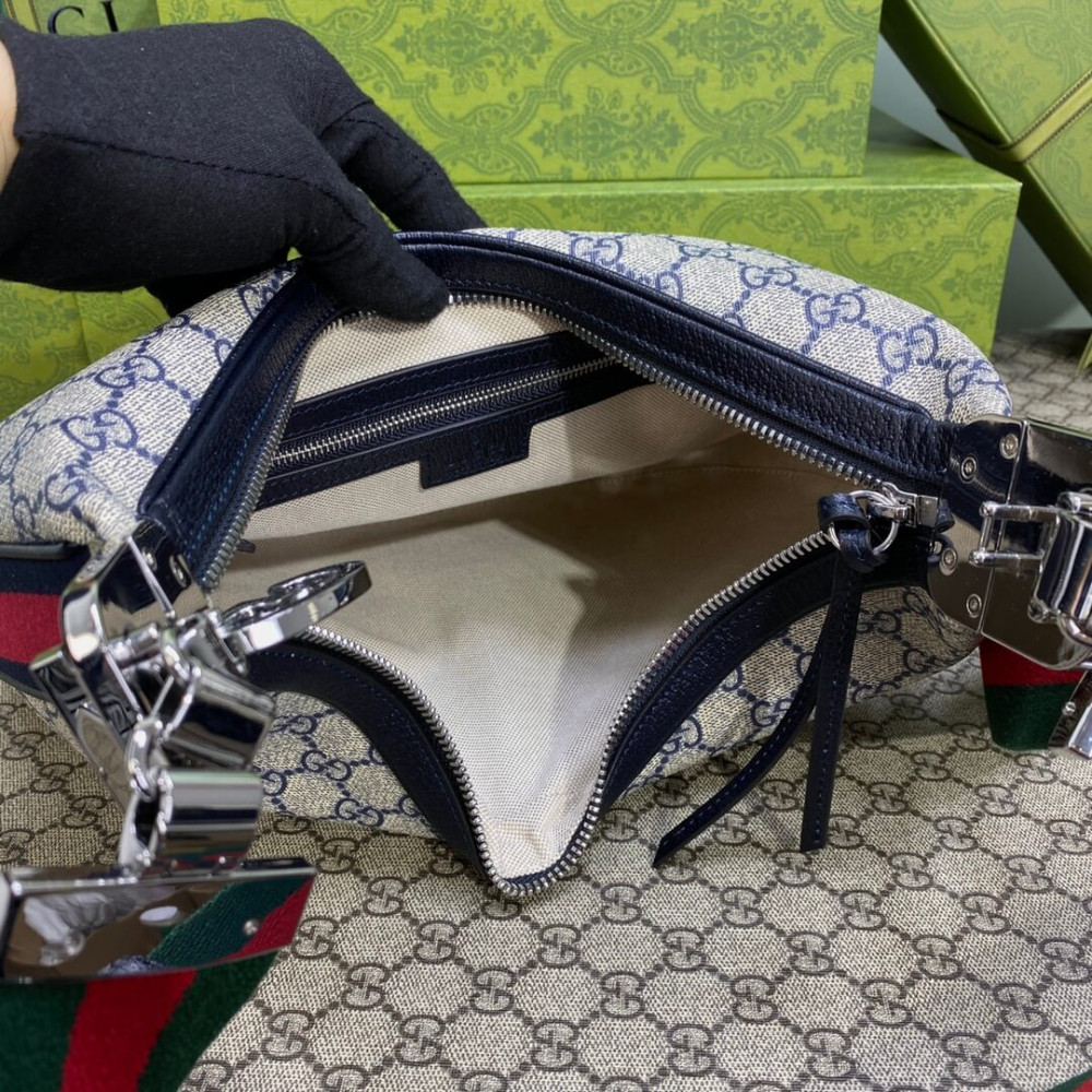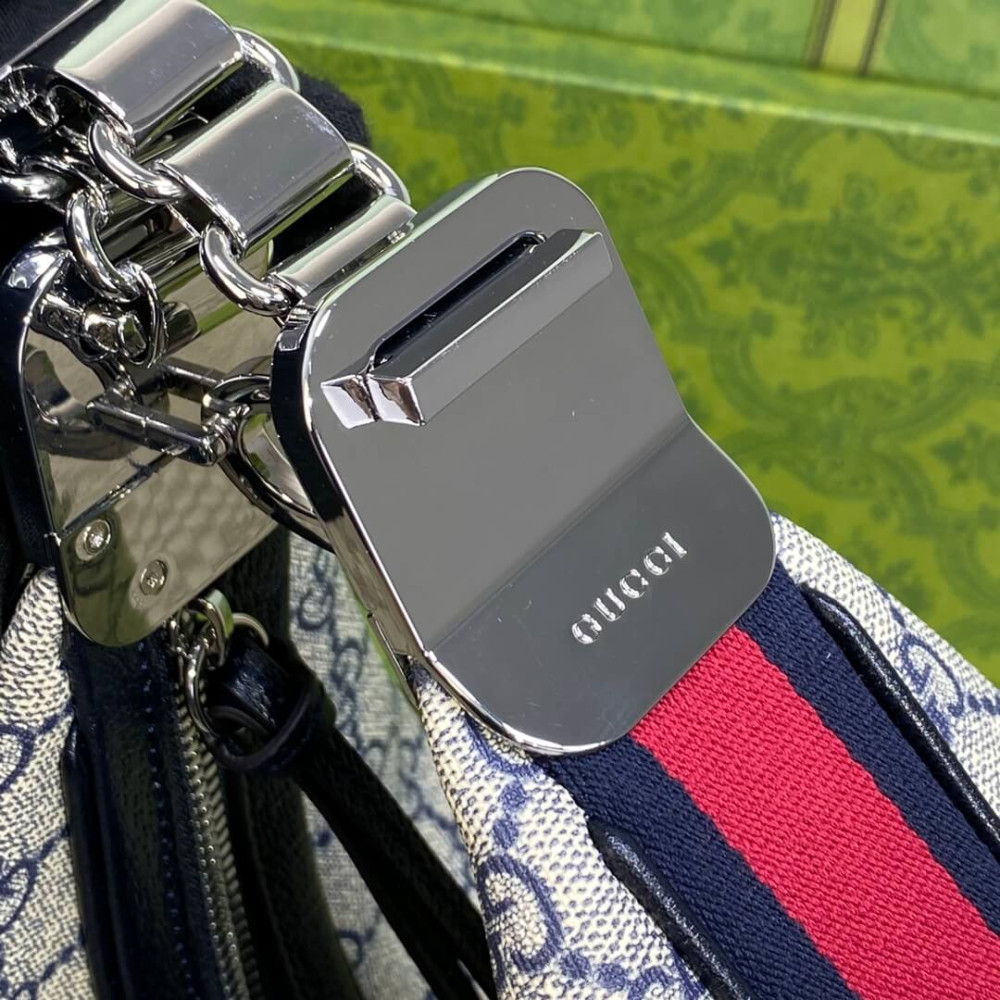 An ode to the timeless Hollywood glamour that shaped Gucci Love Parade, classic elements from the House’s archives are reintroduced. Distinguished by its crescent moon shape, the accessory is further defined by a G shaped hook closure. Paired with soft materials, the heritage hardware creates a refined design with vintage appeal. This medium version is crafted from beige and blue GG Supreme canvas, complete with a blue and red Web trim.