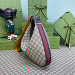 An ode to the timeless Hollywood glamour that shaped Gucci Love Parade, classic elements from the House’s archives are reintroduced. Distinguished by its crescent moon shape, the accessory is further defined by a G shaped hook closure. Paired with soft materials, the heritage hardware creates a refined design with vintage appeal. This medium version is crafted from beige and blue GG Supreme canvas, complete with a blue and red Web trim.