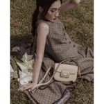 Petite versions of the Gucci Horsebit 1955 add a hybrid twist to the vintage inspired line. Enriched with two different shoulder straps, the mini bag’s character transforms from understated elegance with a tonal leather strap to a strong logo feel thanks to a red and green Web option. The accessory is presented in monogram canvas with a brown leather trim.