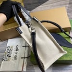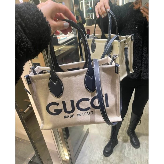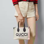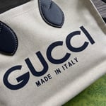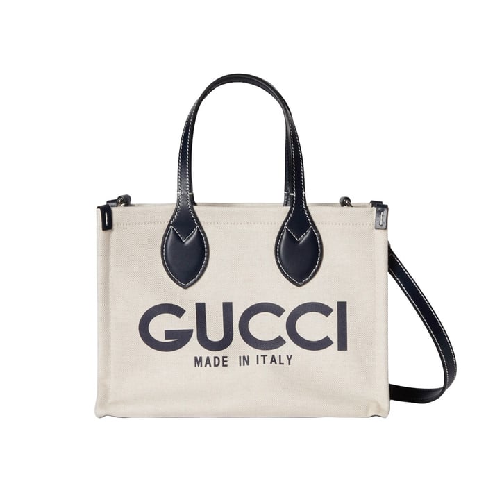 Well-known prints of the House constantly evolve to tell a unique narrative. An essential storytelling element of the Cruise 2024 collection, the ‘Gucci Made in Italy’ print defines this beige canvas tote bag with a light brown trim and GG Supreme lining.