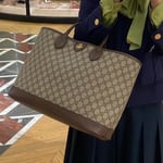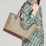 The Ophidia line continues to be one of Gucci signature handbags. New silhouettes are introduced each season, providing versatile accessories to complete any look. Two handles transform this tote bag, allowing it to be styled either as a shoulder bag or top handle. The Double G remains integral to the design, presented in GG Supreme canvas with a brown leather trim.