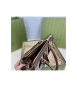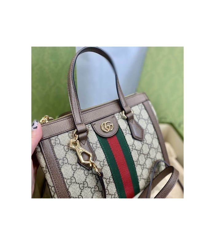 The world of Ophidia evolves with the introduction of a small top handle tote with a detachable shoulder strap. Crafted in GG Supreme canvas with inlaid green and red Web stripe, the accessory is enhanced by a petite play on the Double G, an archival Gucci code from the ’70s that appears atop a leather tab detail and on the zipper pull.