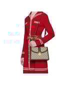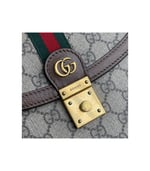 The world of Ophidia continues to evolve with new iterations each season. The top handle bag is presented as part of the Epilogue collection with a detachable shoulder strap. The vintage influenced square shape is accentuated by the House Web stripe and Double G hardware—a contemporary take on a Gucci archival belt buckle from the ’70s. Crafted from the House’s monogram canvas, the style has a strong logo feel.