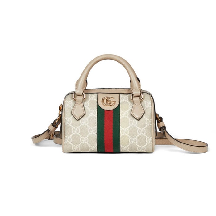 The Ophidia line is enriched by the introduction of the boston mini bag. Crafted from beige and ebony GG Supreme canvas, the accessory is enriched by the Double G hardware and a Web stripe. A detachable shoulder strap completes the design.