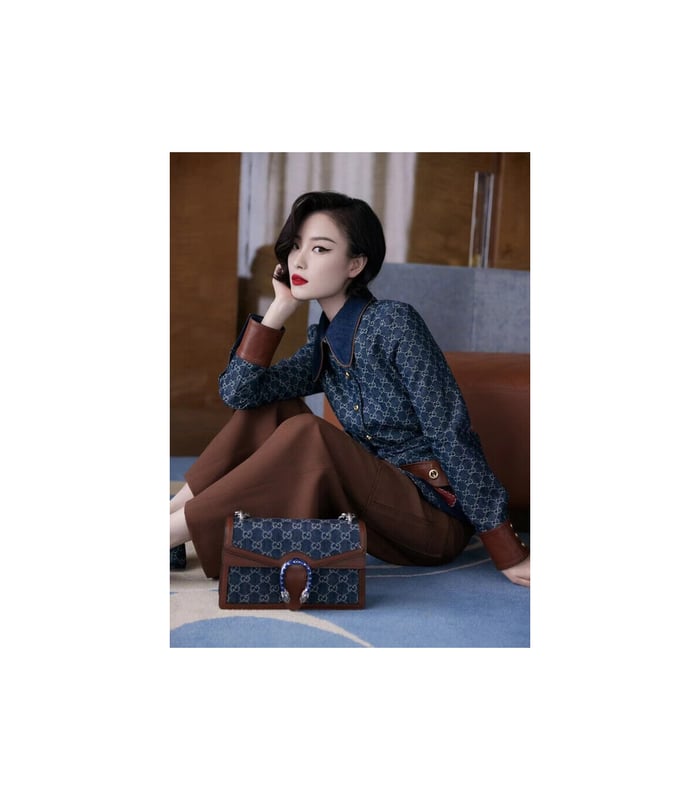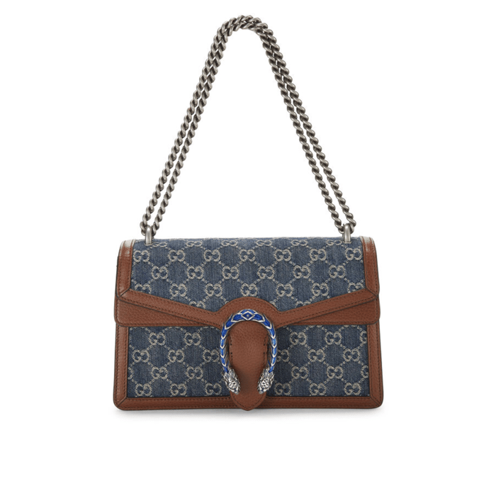 From the Epilogue collection, this timeless piece breaks away from fashion’s fleeting trends. Crafted from eco-washed organic GG jacquard denim, the iconic Dionysus features the House’s signature tiger head closure with blue enamel detailing.