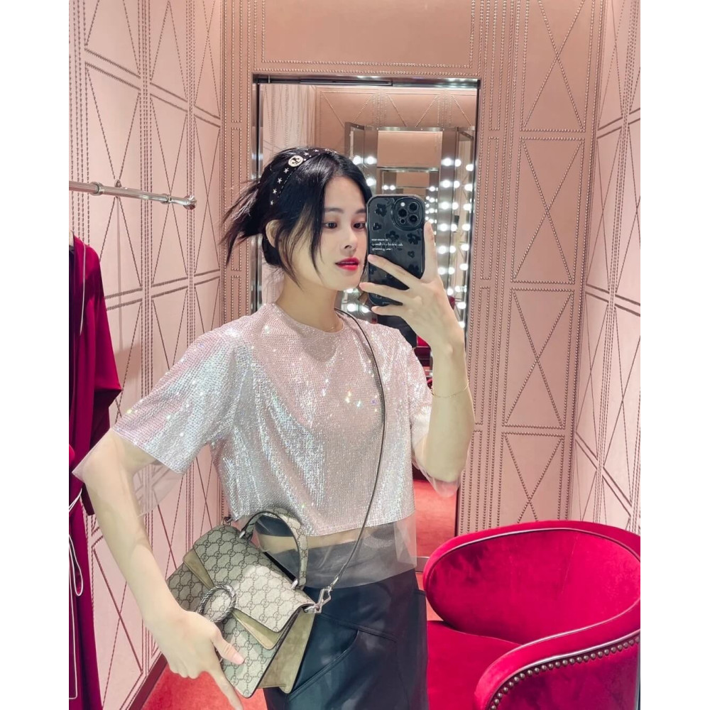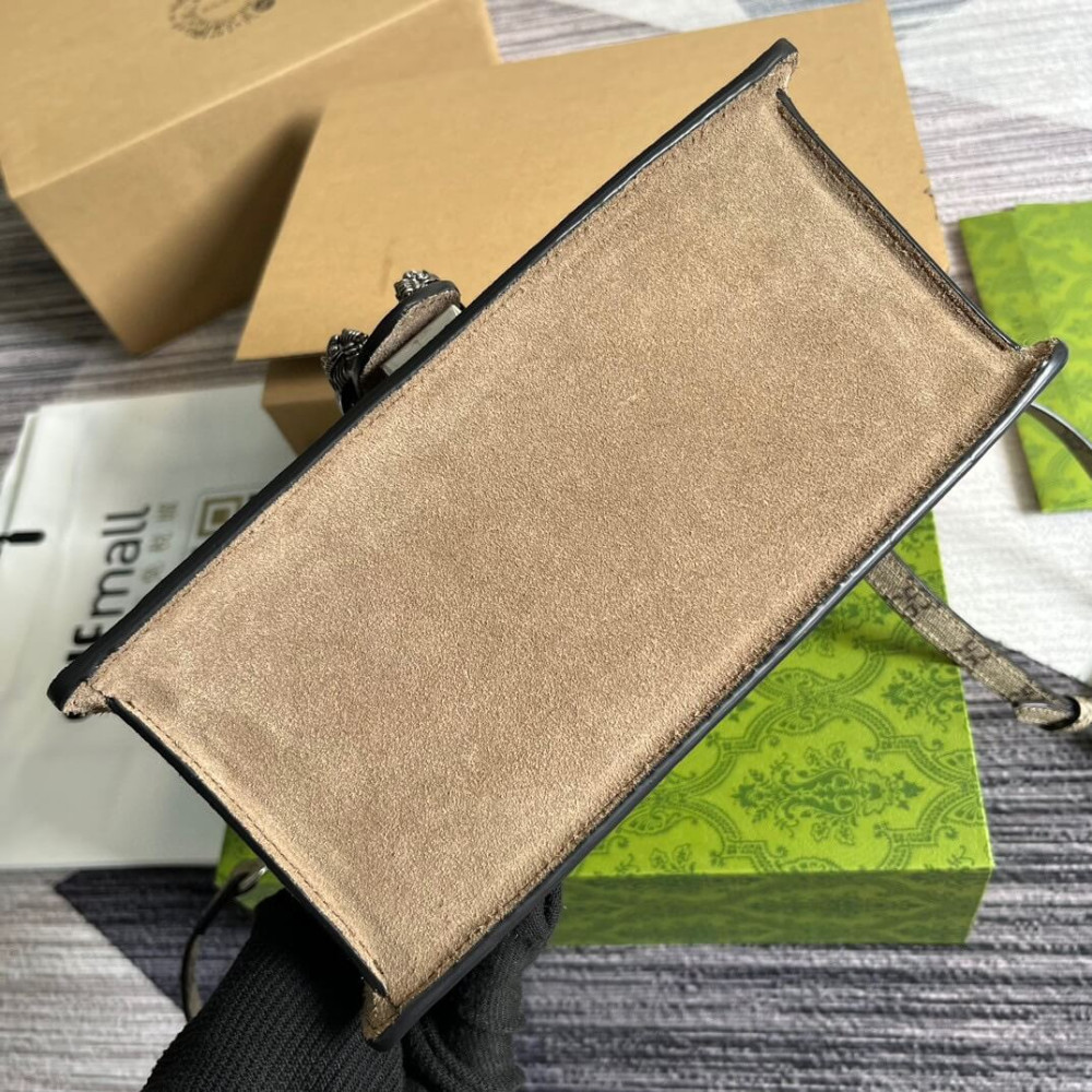 A structured GG Supreme canvas top handle bag appears beige and ebony with subtle taupe suede trim. The textured tiger head closure defines the front as a unique hardware detail.