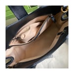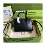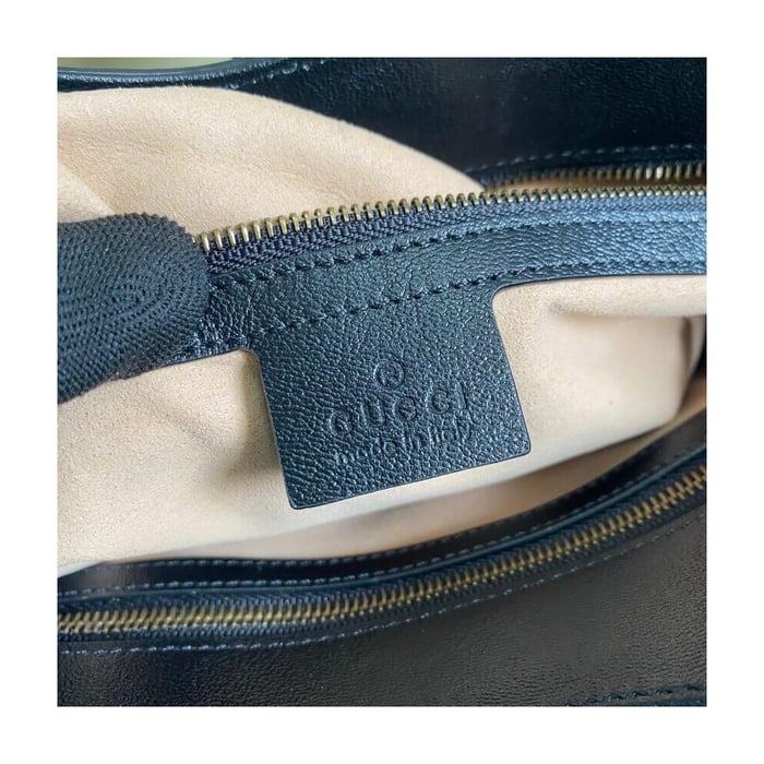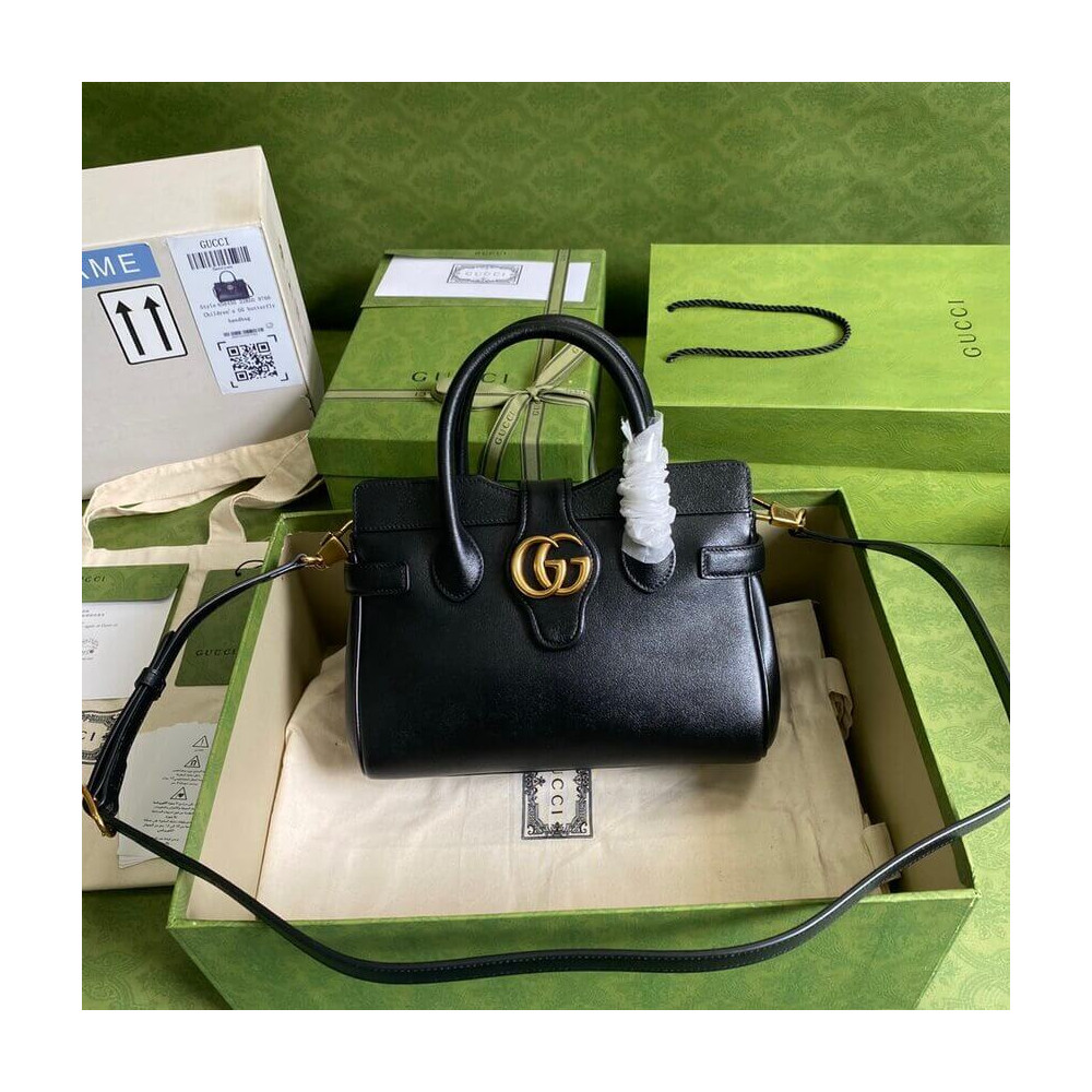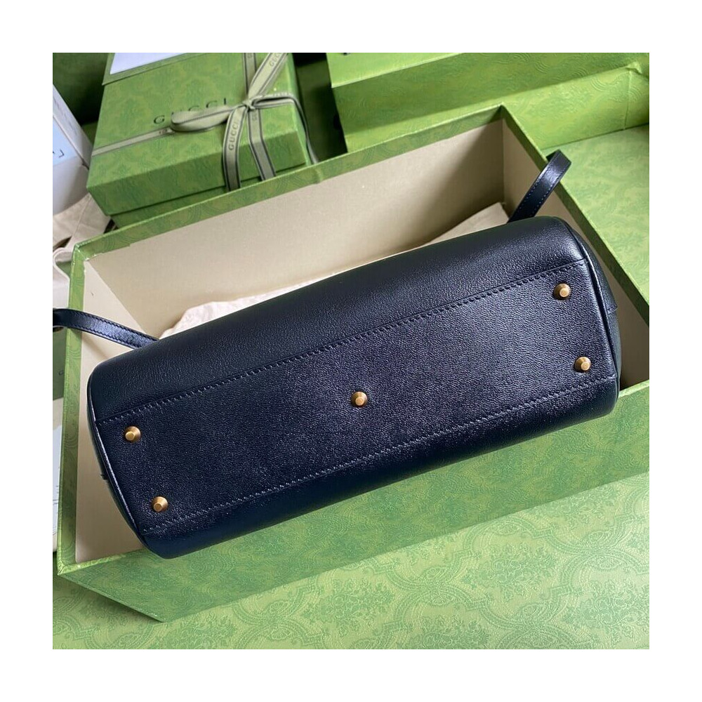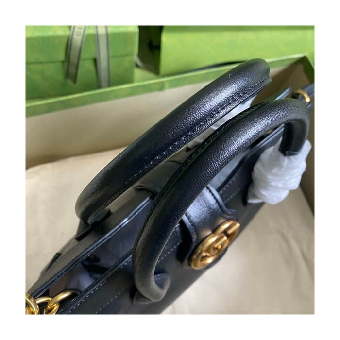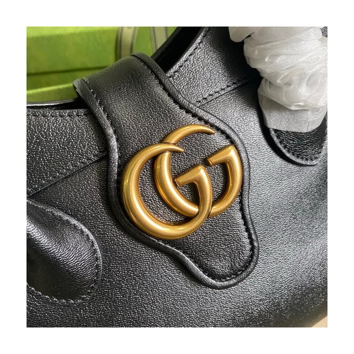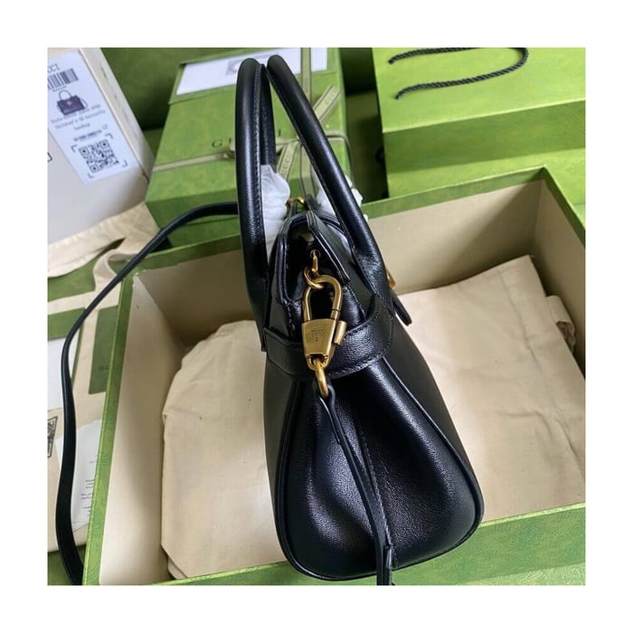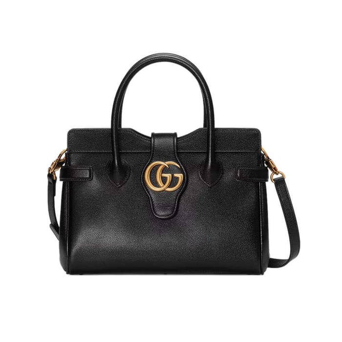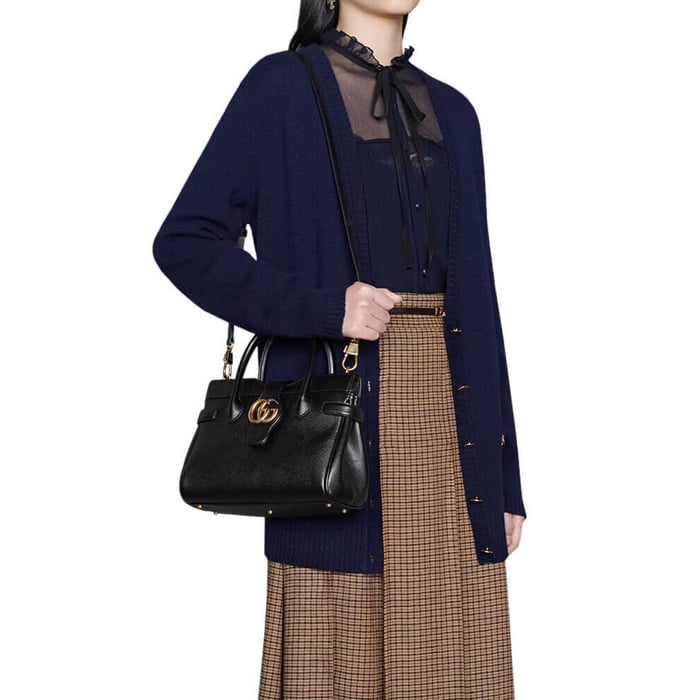 Taken from the ’70s archives, the Double G recalls one of the heydays of the House. The hardware first appeared as a monogram belt buckle but has evolved into one of the brand’s most emblematic codes. Here, the gold-toned detail defines a top handle bag in black leather. A detachable shoulder strap adds a versatile note to the style.