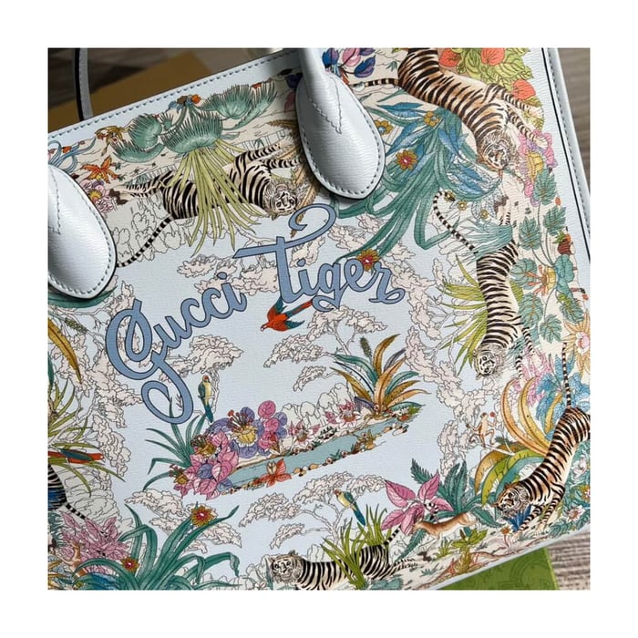 Gucci presents a reinterpretation of a late 1960s archival design by Vittorio Accornero—the artist and illustrator who created the House’s signature Flora print. The tiger, a motif often seen in Alessandro Michele’s collections, features atop this leather tote bag against a colorful backdrop of greenery and flowers.