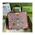 Children’s storybooks continue to inspire the House. Here. this children’s tote bag pairs the GG monogram motif with a cartoon-inspired woodland print. The joyful pattern features plants from the forest as dancing characters.