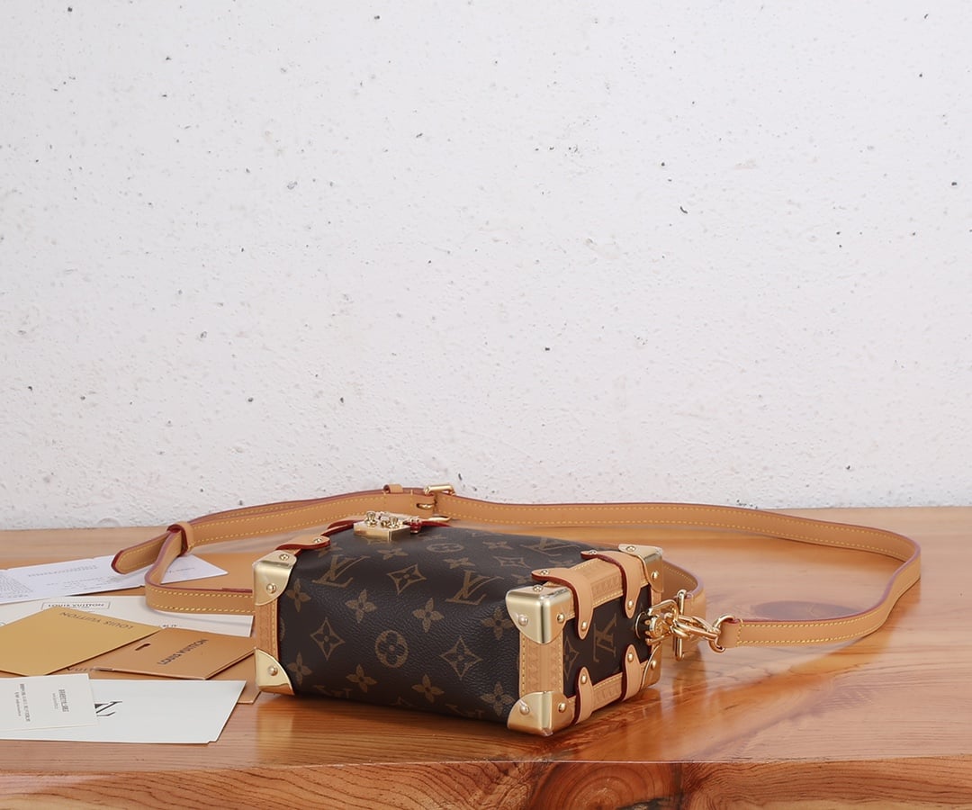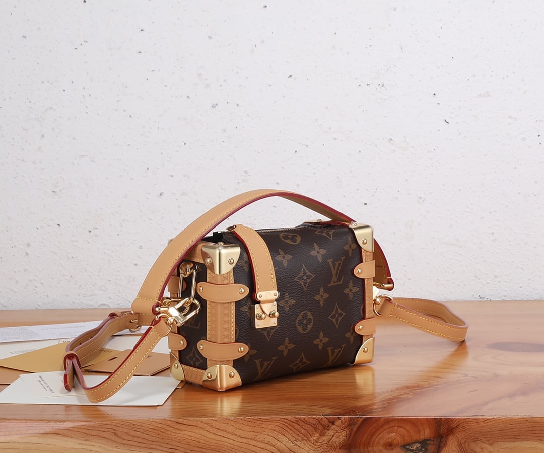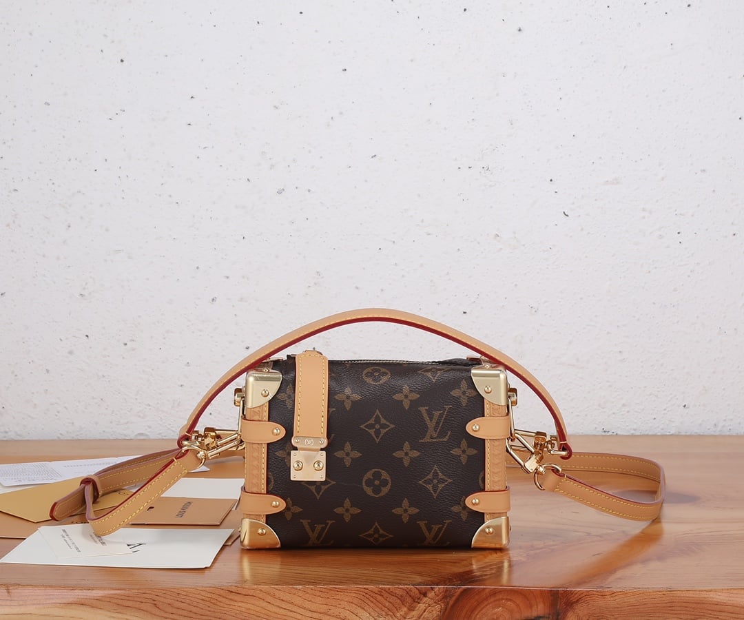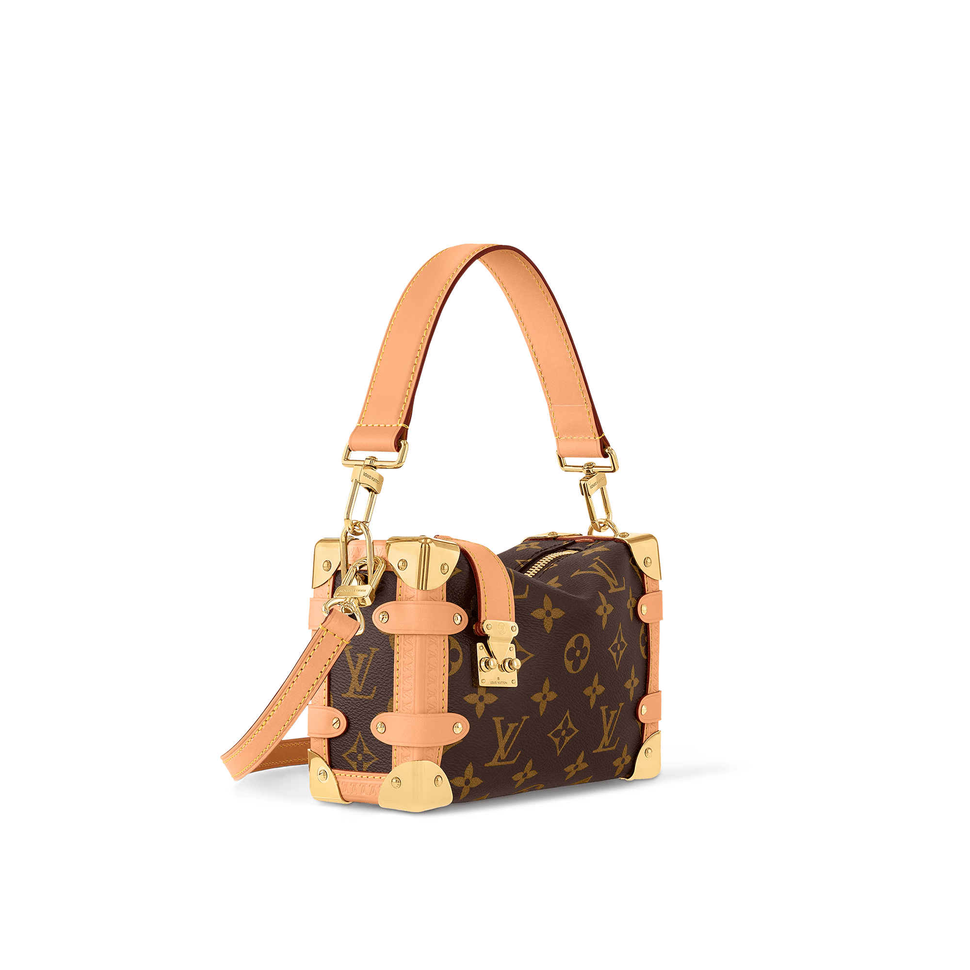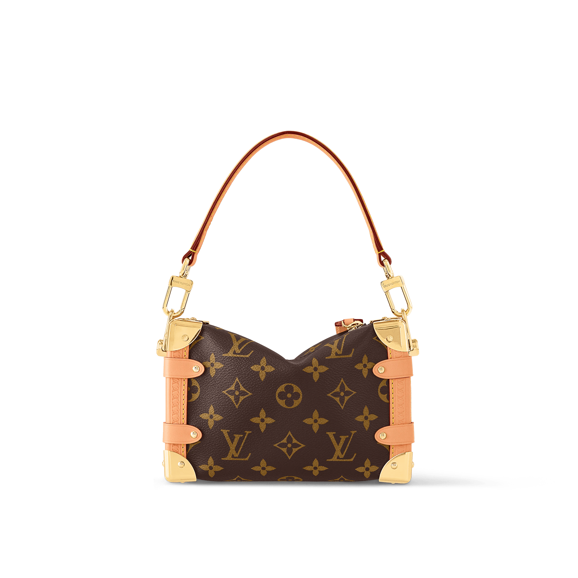 Evocative of the House’s historic trunks, the Side Trunk PM’s rectangular shape is fashioned from Monogram canvas with cowhide-leather trim and gold-color hardware. The reinforced corners and S-lock attached to the zipper are directly inspired by Louis Vuitton trunks. It can be carried by hand or on the shoulder thanks to the removable and adjustable leather strap.