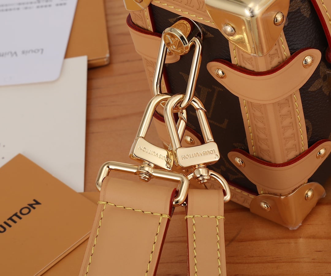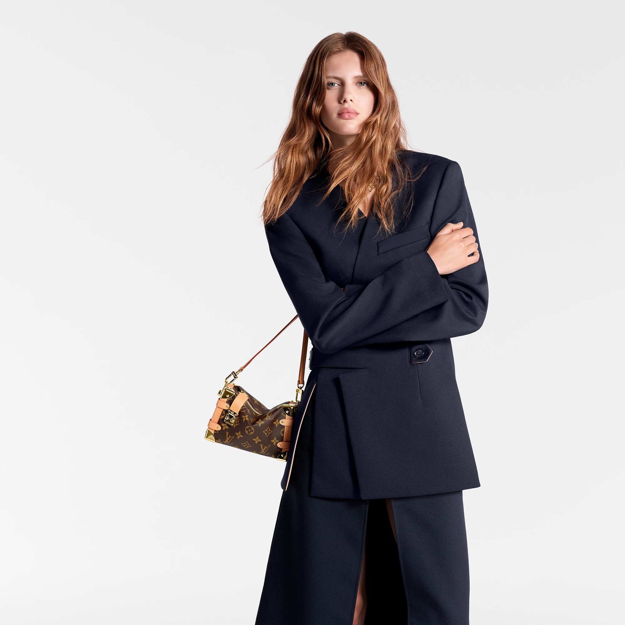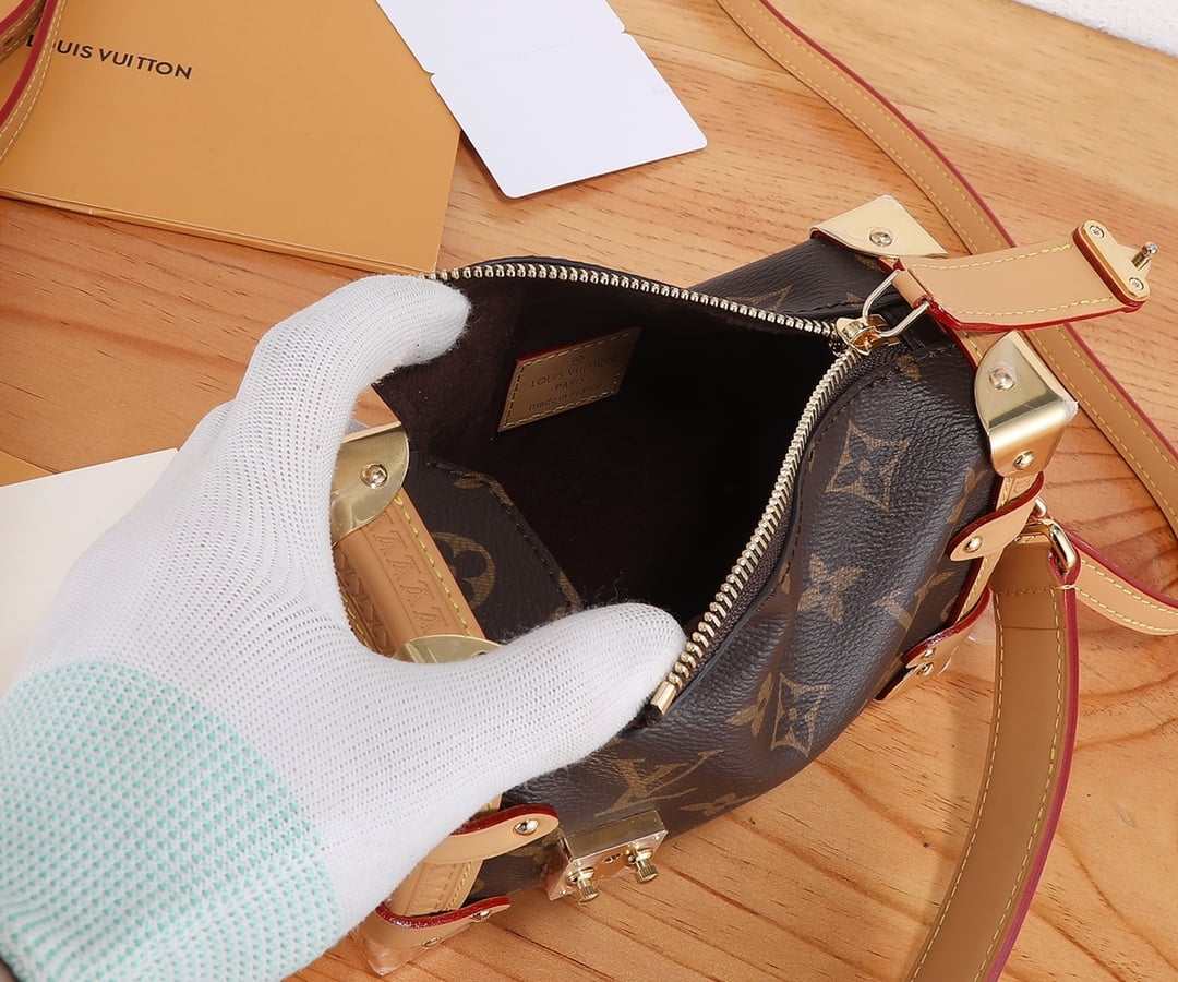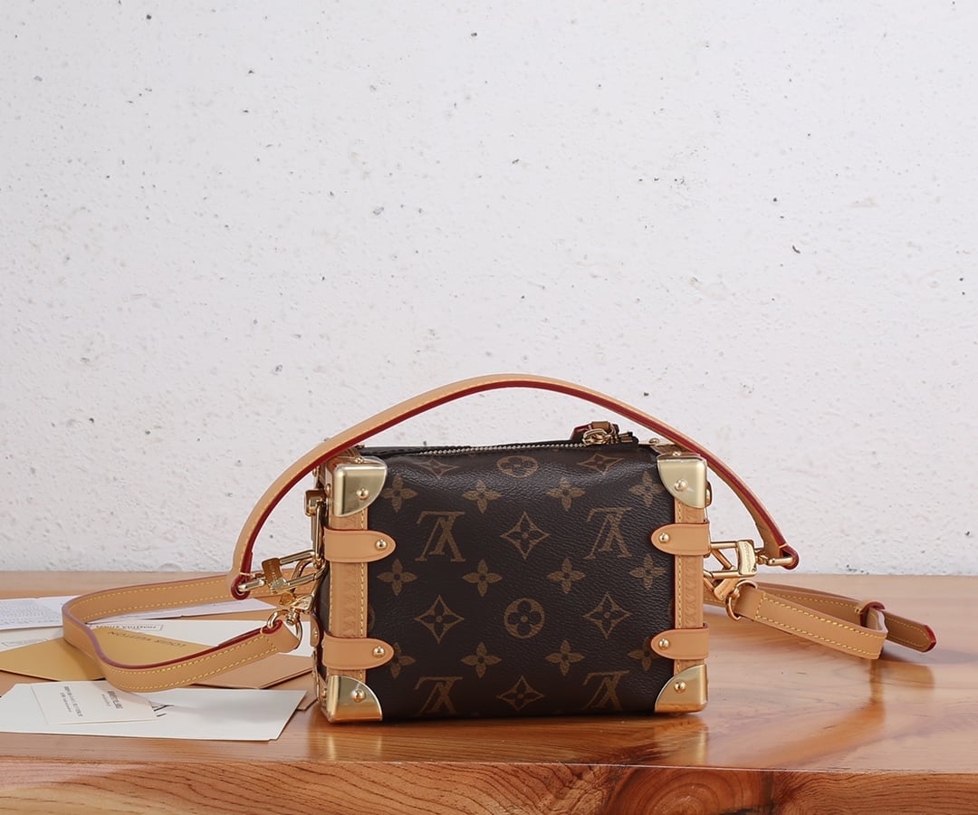 Evocative of the House’s historic trunks, the Side Trunk PM’s rectangular shape is fashioned from Monogram canvas with cowhide-leather trim and gold-color hardware. The reinforced corners and S-lock attached to the zipper are directly inspired by Louis Vuitton trunks. It can be carried by hand or on the shoulder thanks to the removable and adjustable leather strap.