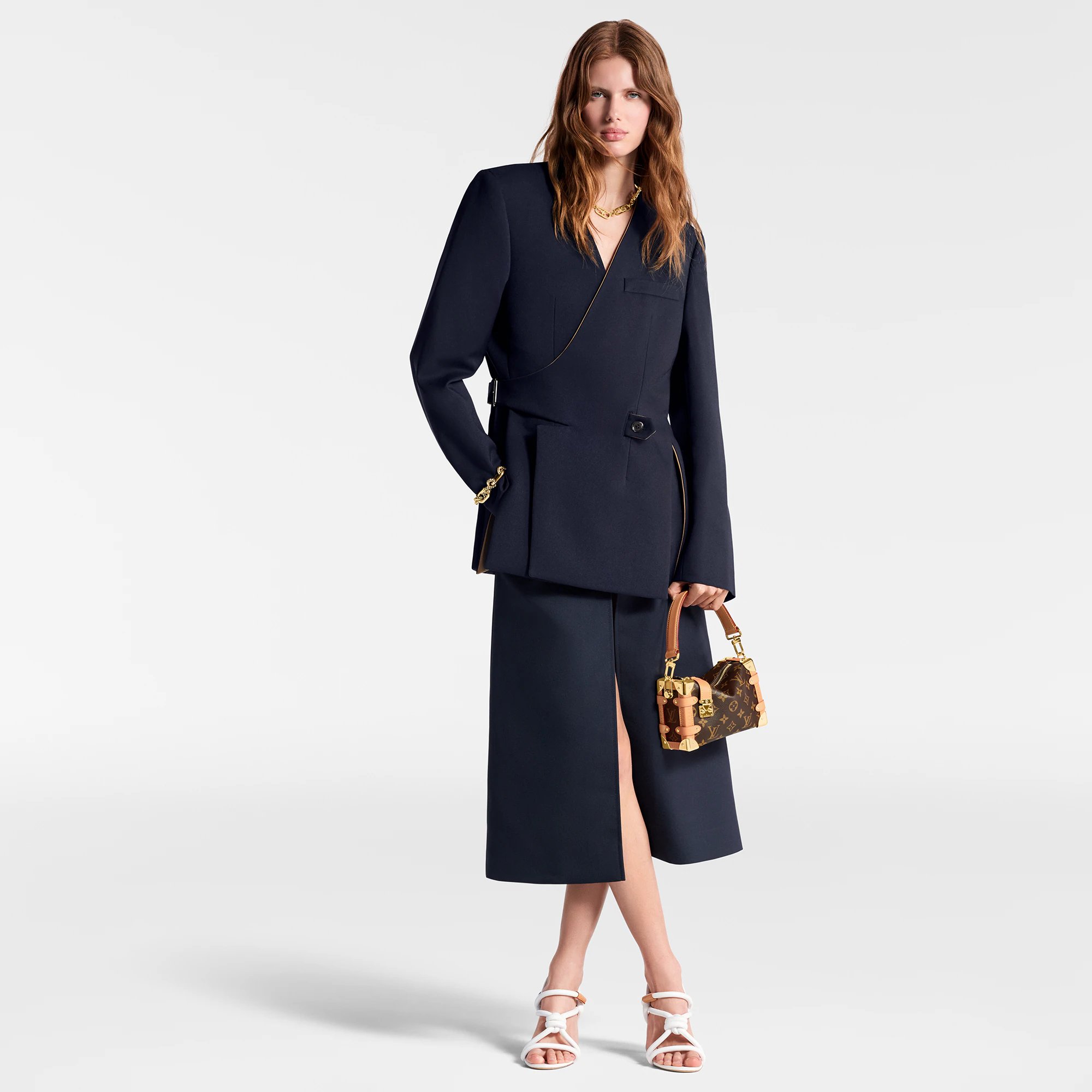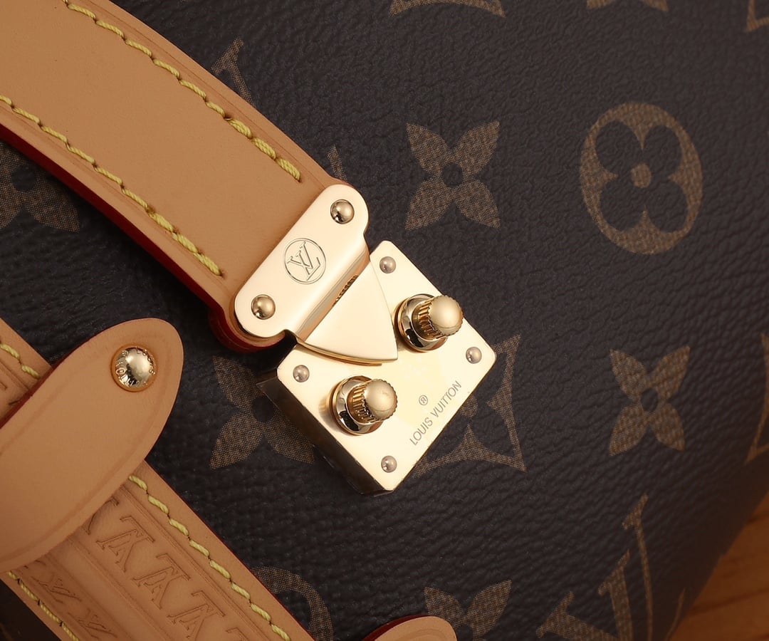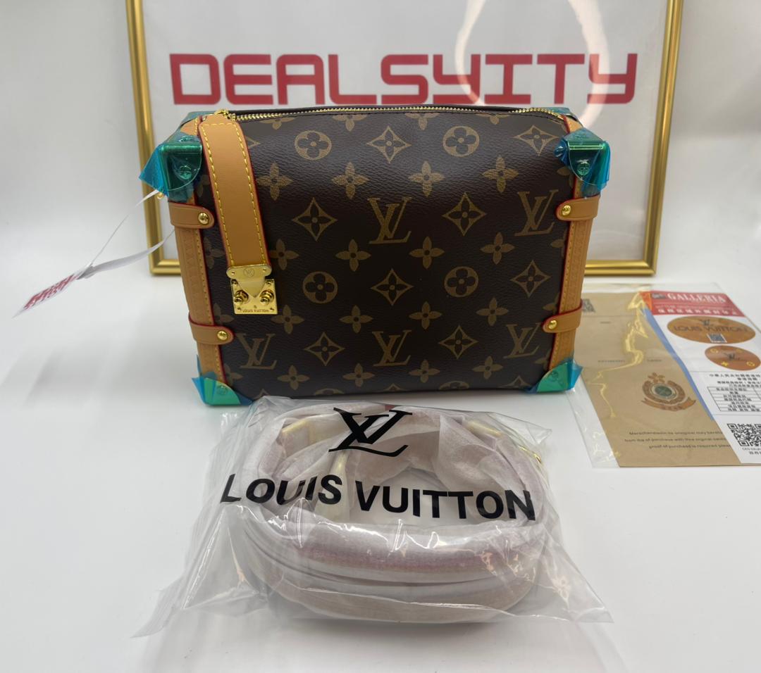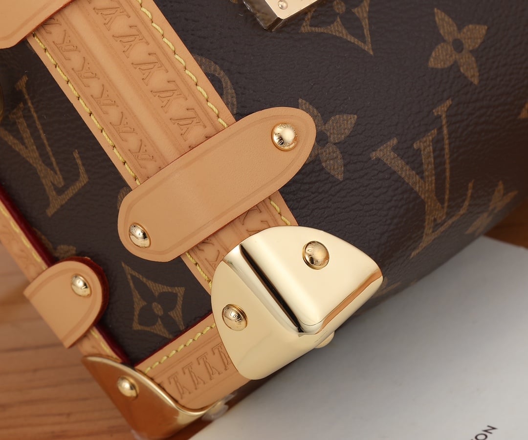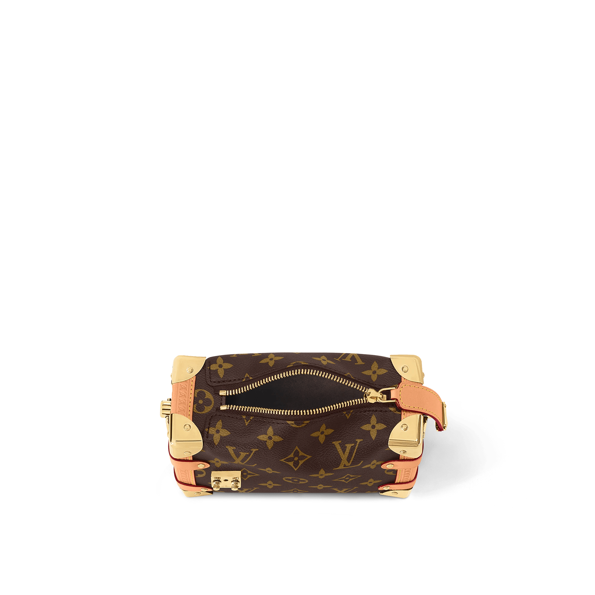 Evocative of the House’s historic trunks, the Side Trunk PM’s rectangular shape is fashioned from Monogram canvas with cowhide-leather trim and gold-color hardware. The reinforced corners and S-lock attached to the zipper are directly inspired by Louis Vuitton trunks. It can be carried by hand or on the shoulder thanks to the removable and adjustable leather strap.