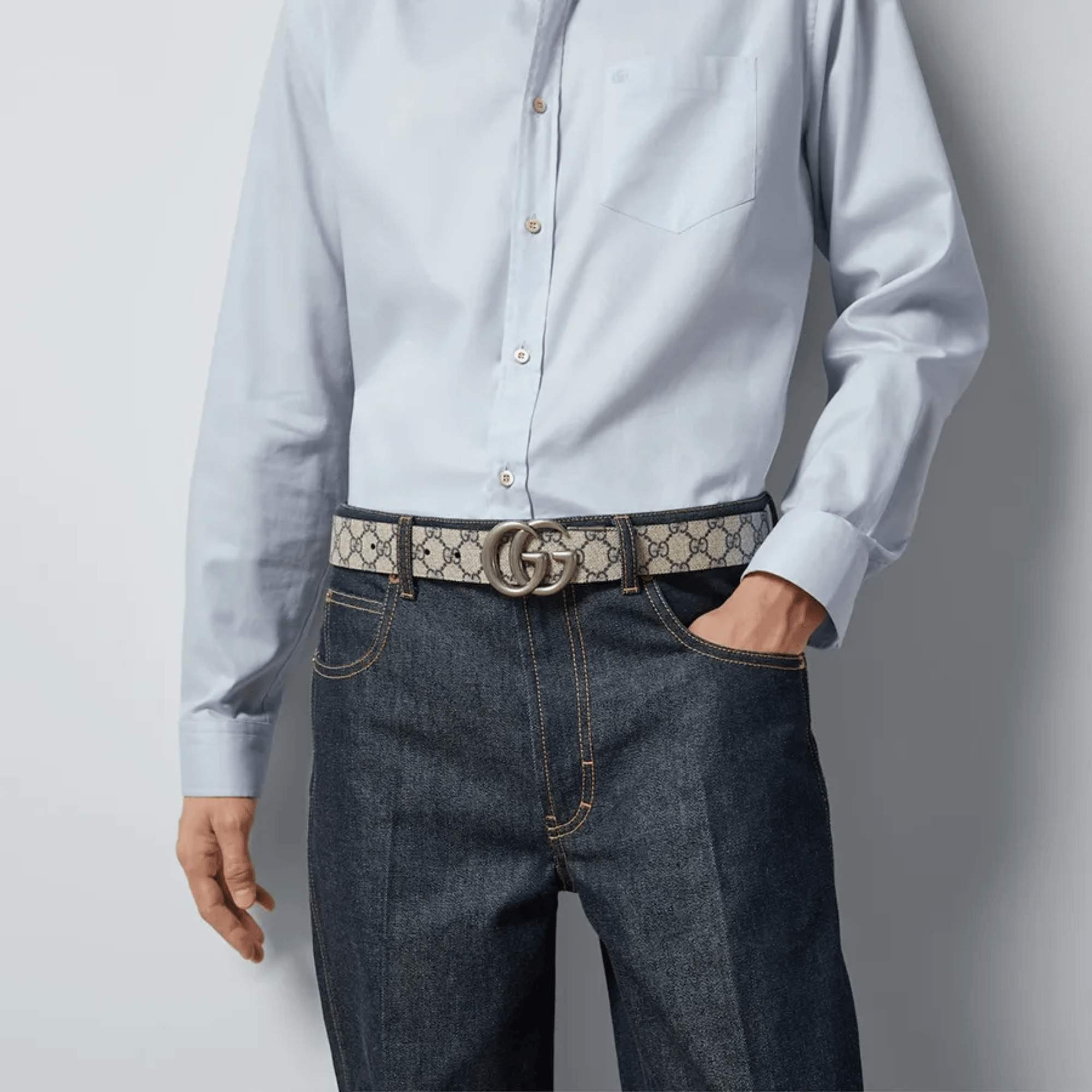Gucci GG Marmont Reversible Beige Blue 35mm Belt For Men is a high-end fashion accessory that helps complete the sophisticated and luxurious style for men. The design of the iconic GG Marmont metal buckle combined with a luxurious leather strap.