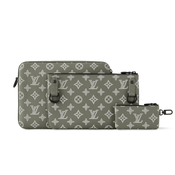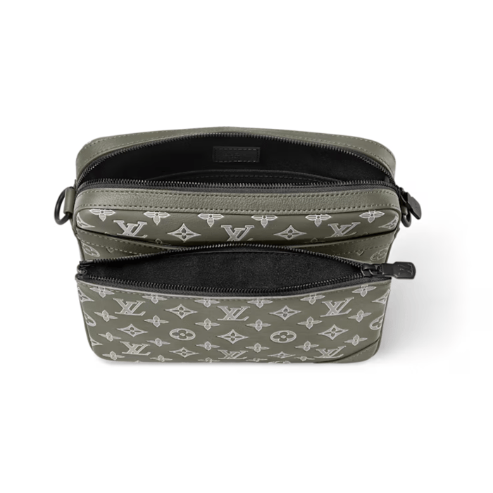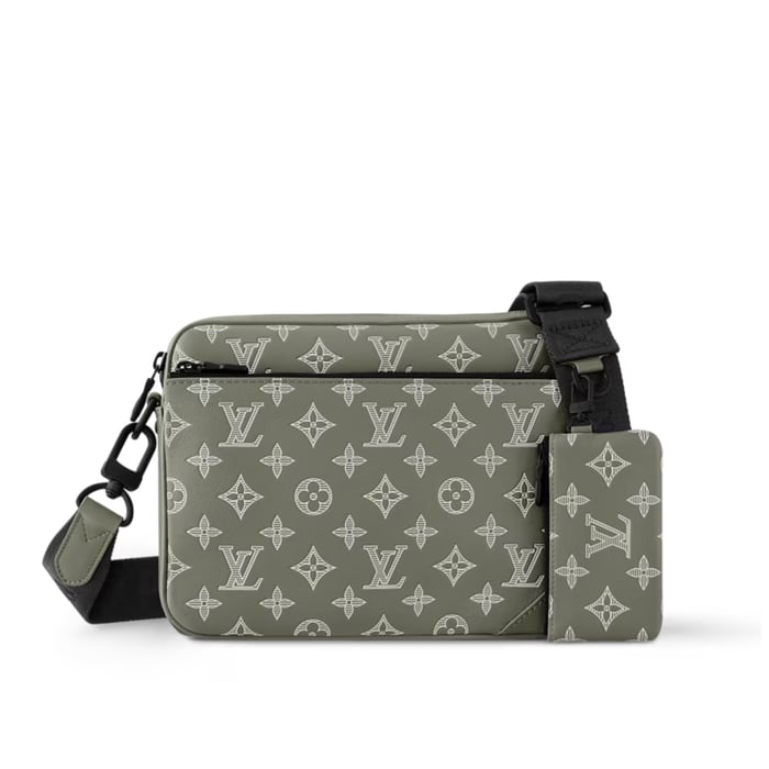 This Trio Messenger bag is fashioned from Monogram Shadow embossed leather in a sporty colorway. The embossed Monogram pattern brings style while the suppleness of the calfskin makes the bag unusually body friendly. The Trio is composed of a main pouch, a removable front zipped pocket, and a small detachable coin purse on the strap.