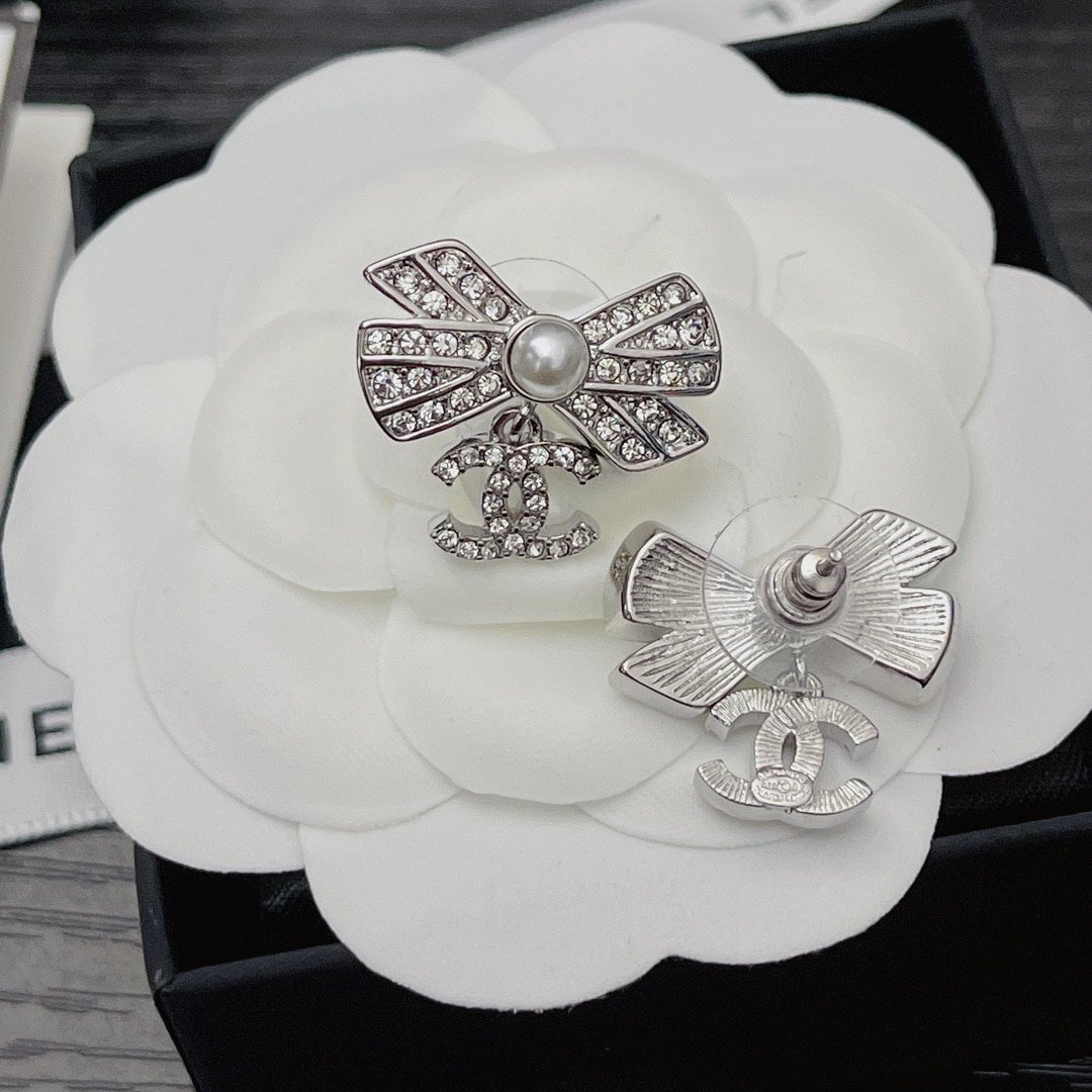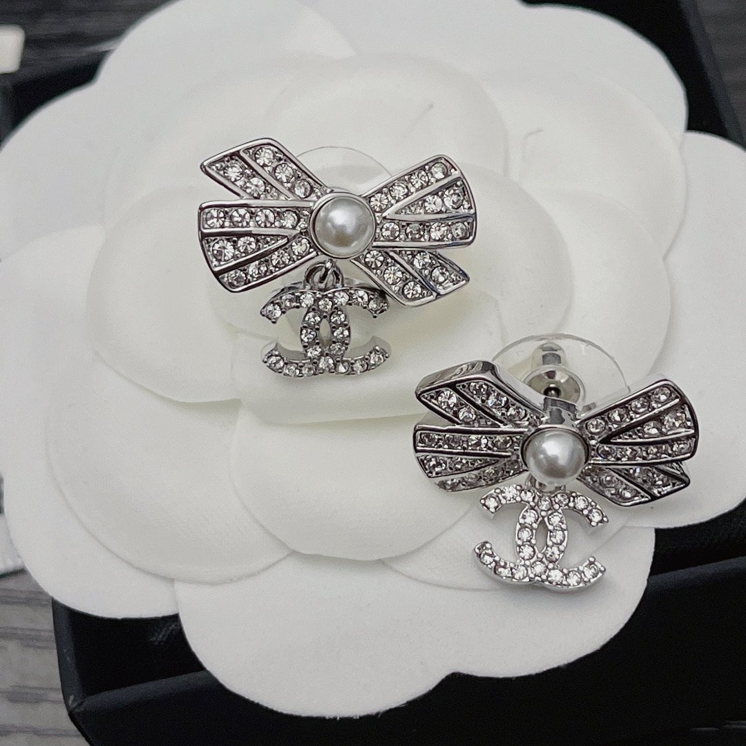 Chanel Crystal Cc Bow Drop Earrings Silver