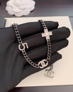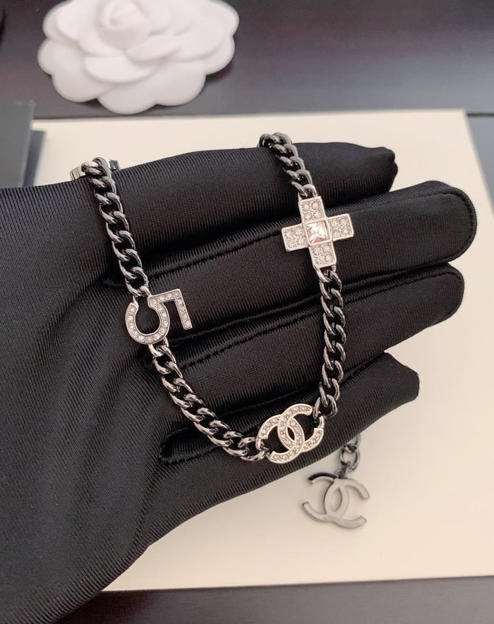Chanel Ruthenium Crystal Chain Cc Lucky Charms Choker Silver Necklace
