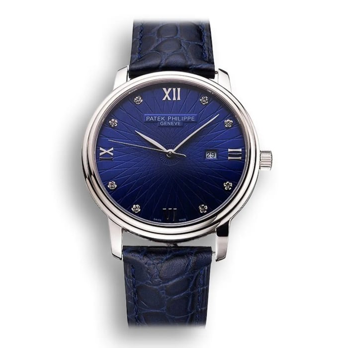 Experience timeless elegance and master craftsmanship with the Patek Philippe Calatrava Date Blue Dial Blue 41 mm Stainless Steel watch. This impeccable timepiece represents the pinnacle of watchmaking, serving not just as a device to tell time, but as a statement of prestige and sophistication. Crafted from high-quality stainless steel, its 41 mm case perfectly houses the stunning blue dial, creating a harmonious balance of color and design that appeals to both classic and contemporary styles.