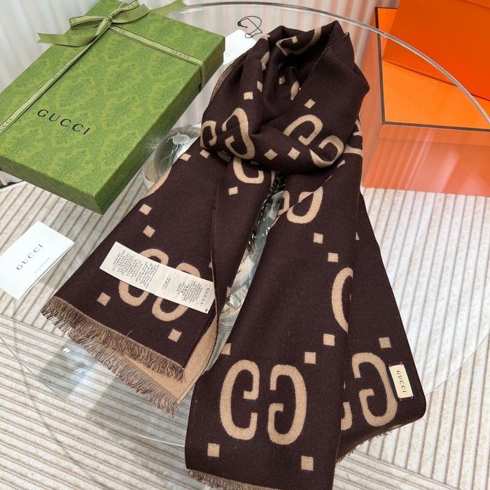 This Gucci scarf is a luxurious accessory featuring the brand’s iconic GG monogram.