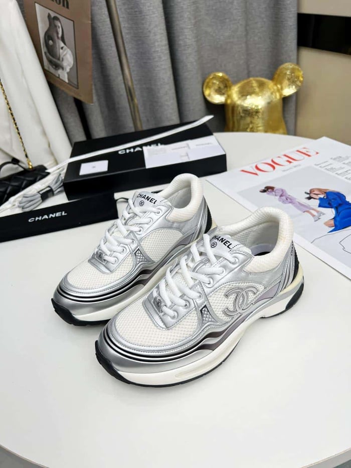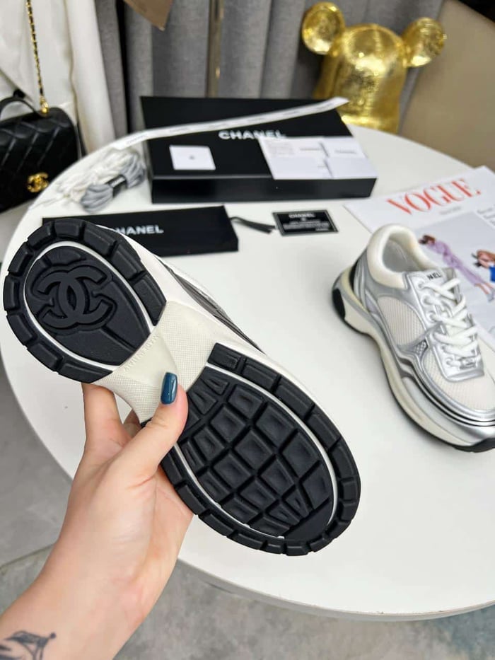 Chanel 23C Silver Metallic Cc Logo Lace Up Flat Runner Trainer Sneaker White G39792 Y56368 K5451