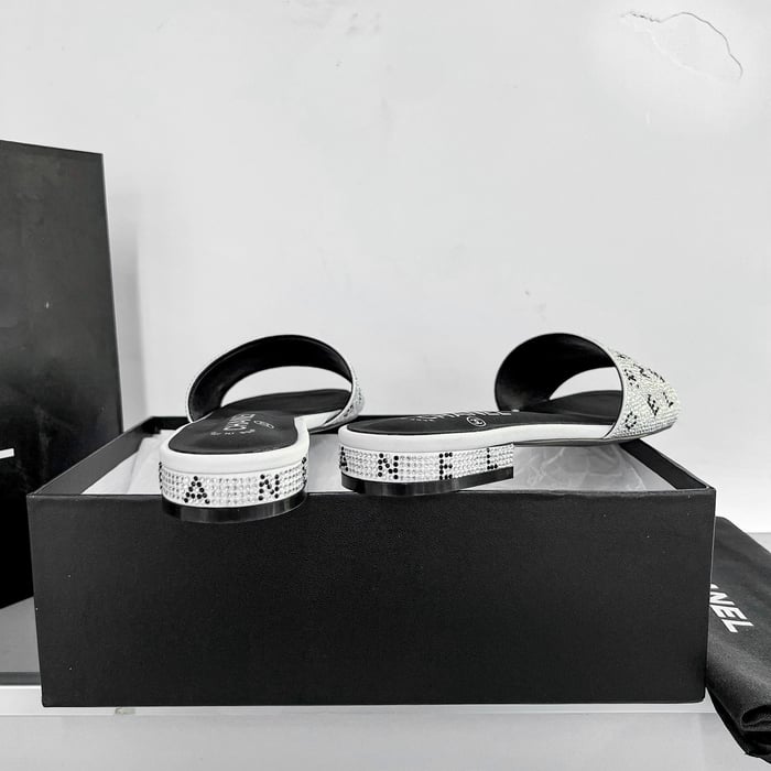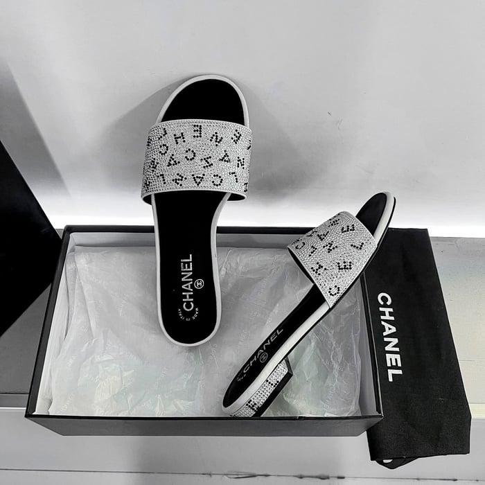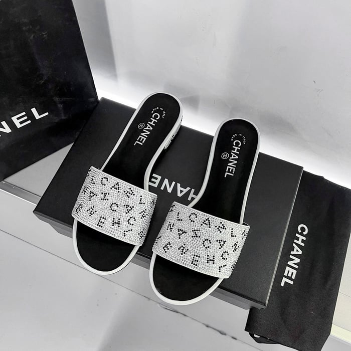 Chanel 24P Beaded Diamond Logo Slippers Silver