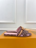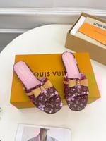 Rare Louis Vuitton x Murakami Cherry Blossom flat sandal in brown monogram canvas. Features pink floral sakura print, gold-tone studded strap, and leather bow accent. Limited Y2K collaboration design.