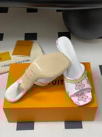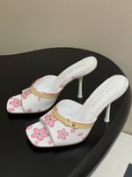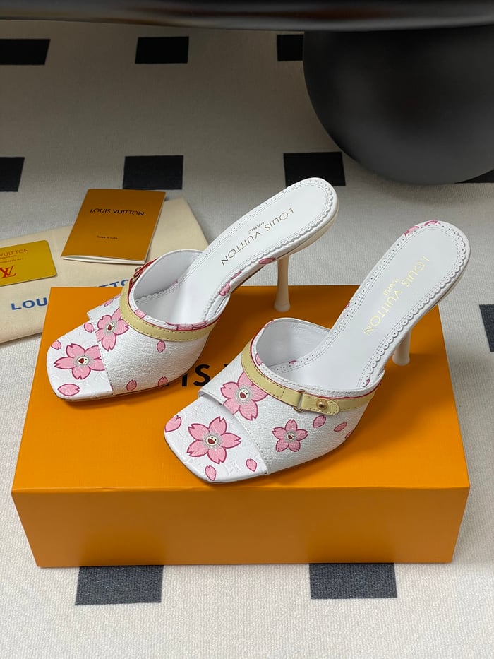 Iconic Louis Vuitton x Murakami Cherry Blossom Mule in white monogram canvas. Features pink sakura floral print, yellow leather strap, and open toe design. Rare Y2K collectible.