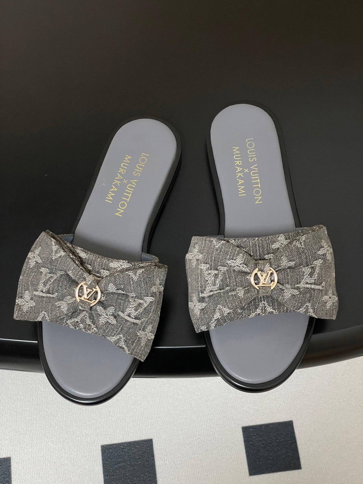 Louis Vuitton x Takashi Murakami Lily Flat Mule Bow Slide Sandals Grey Canvas 1AGVYA